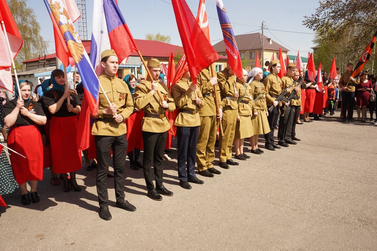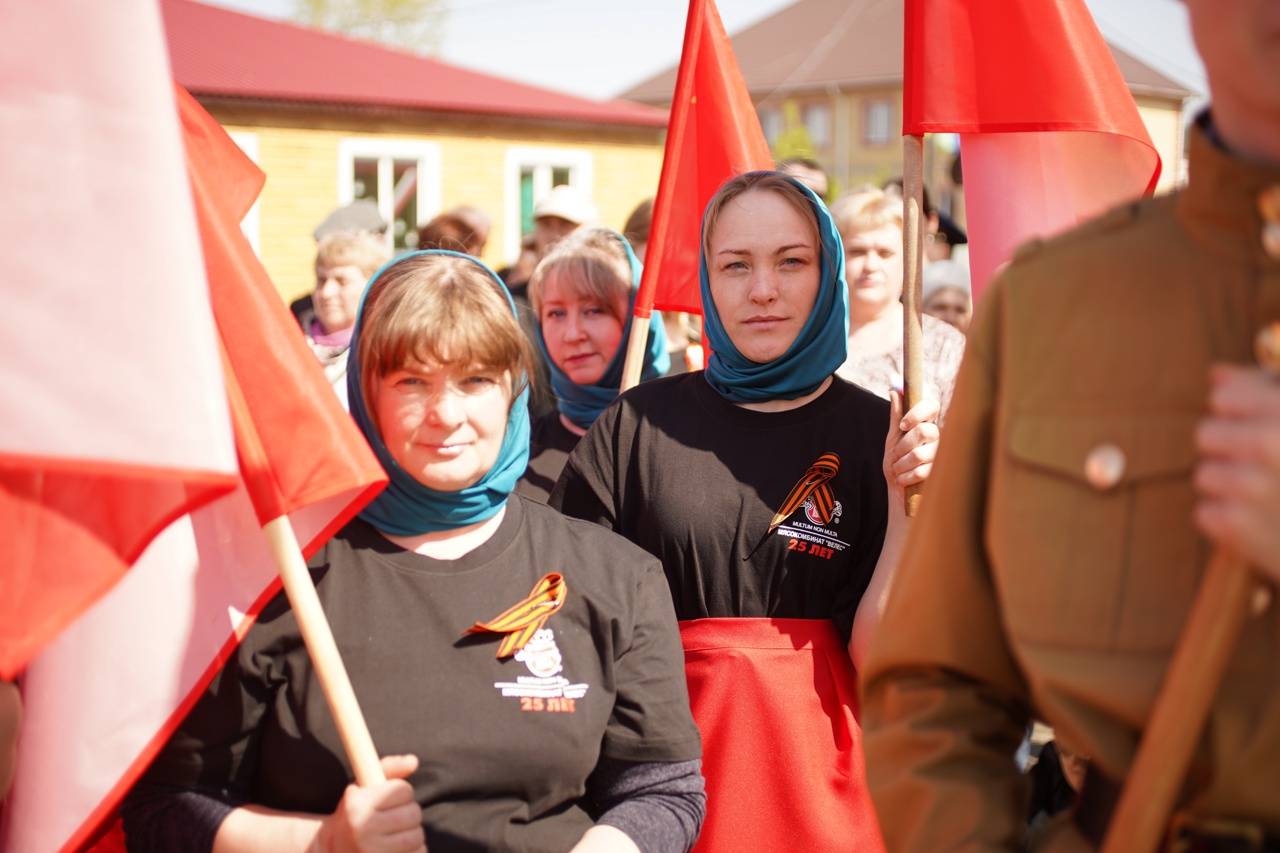 В селе Частоозерье Курганской области Бессмертный полк возглавили женщины, одетые как знаменитая бабушка со Знаменем Победы