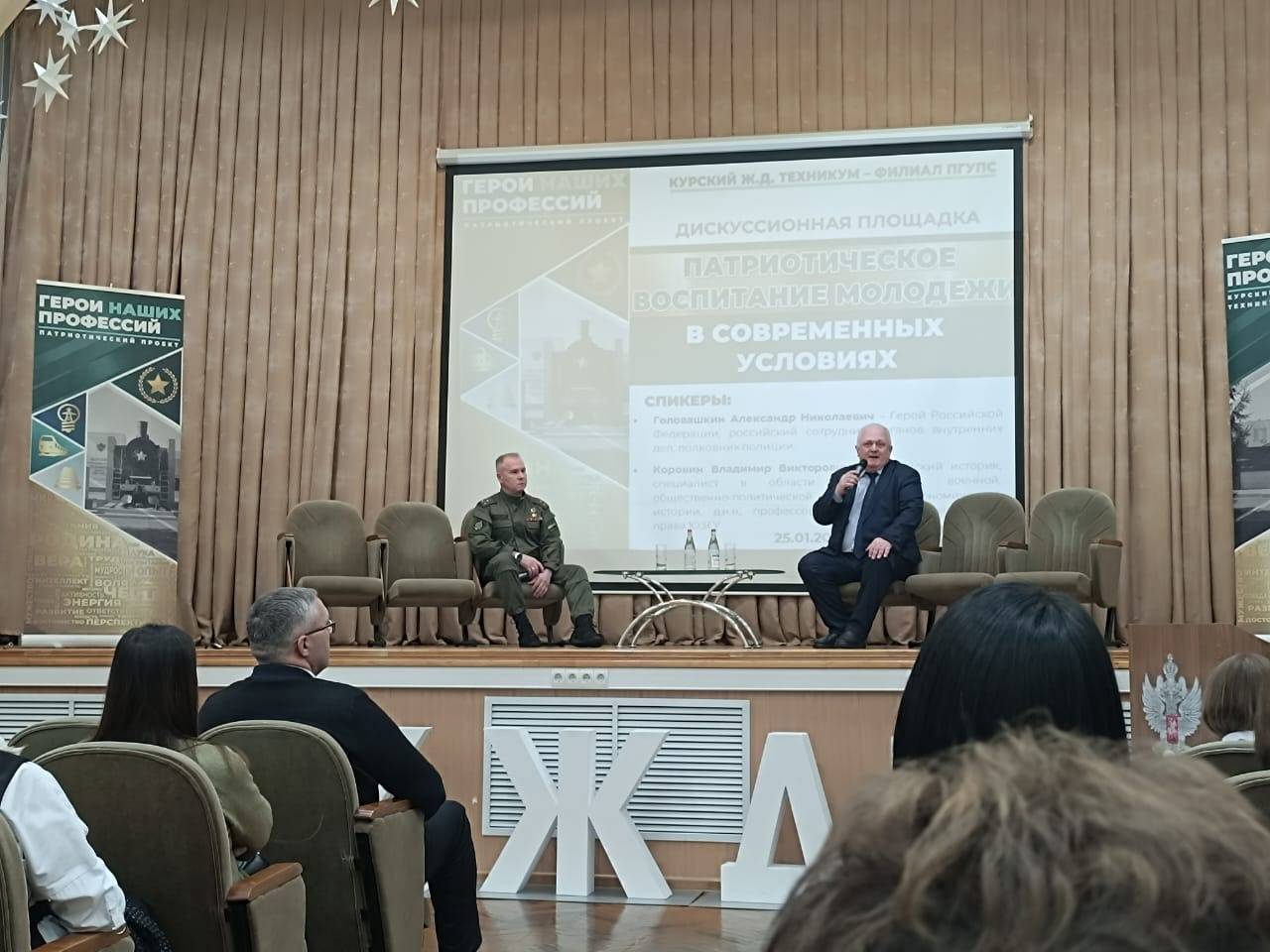 В роли спикеров выступили почетные гости учебного заведения ветеран органов внутренних дел, Герой Российской Федерации Александр Головашкин и председатель Совета регионального отделения РВИО, профессор ЮЗГУ Владимир Коровин.