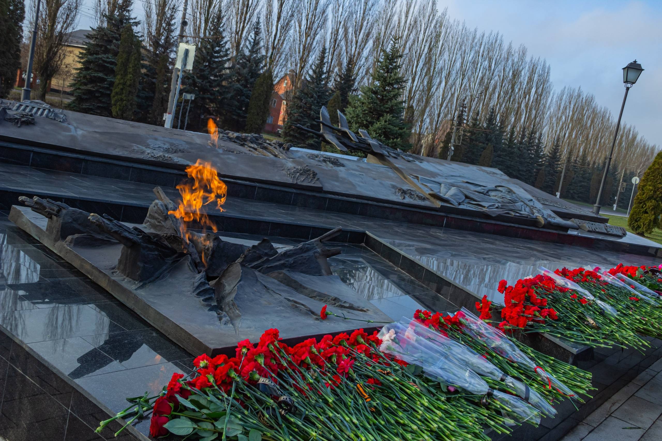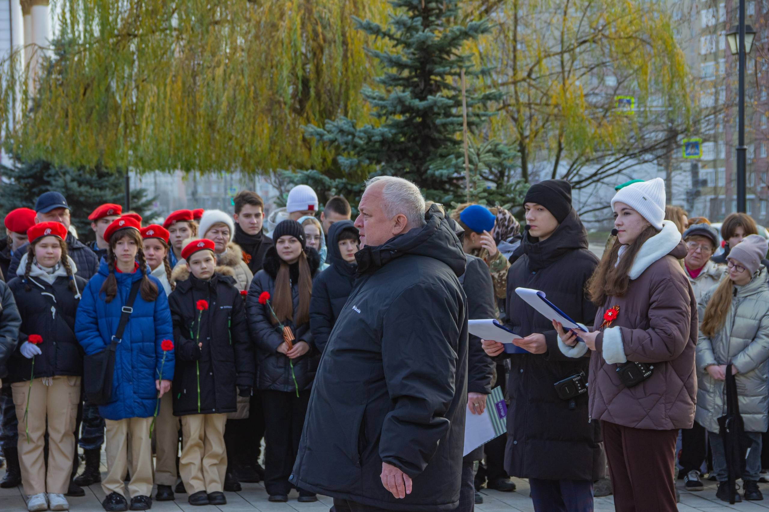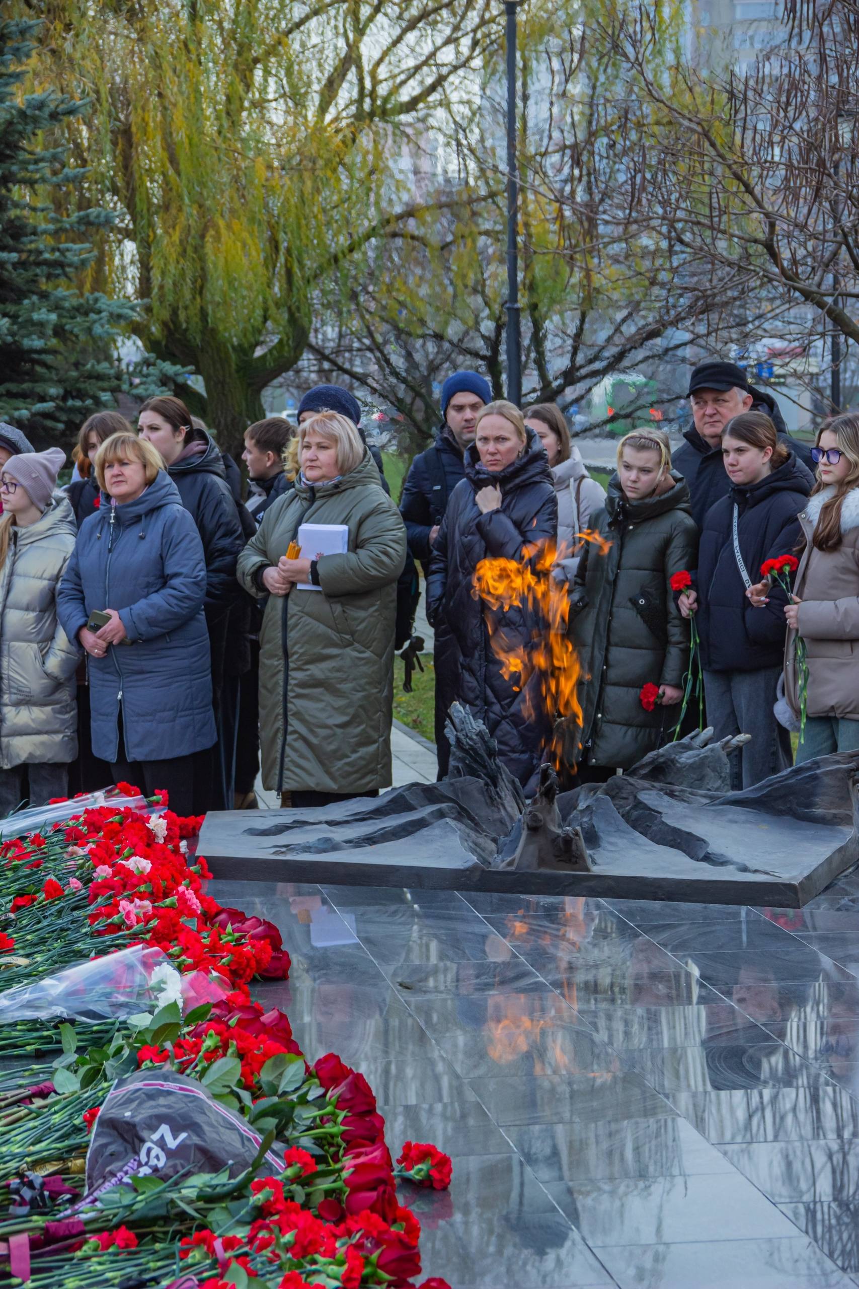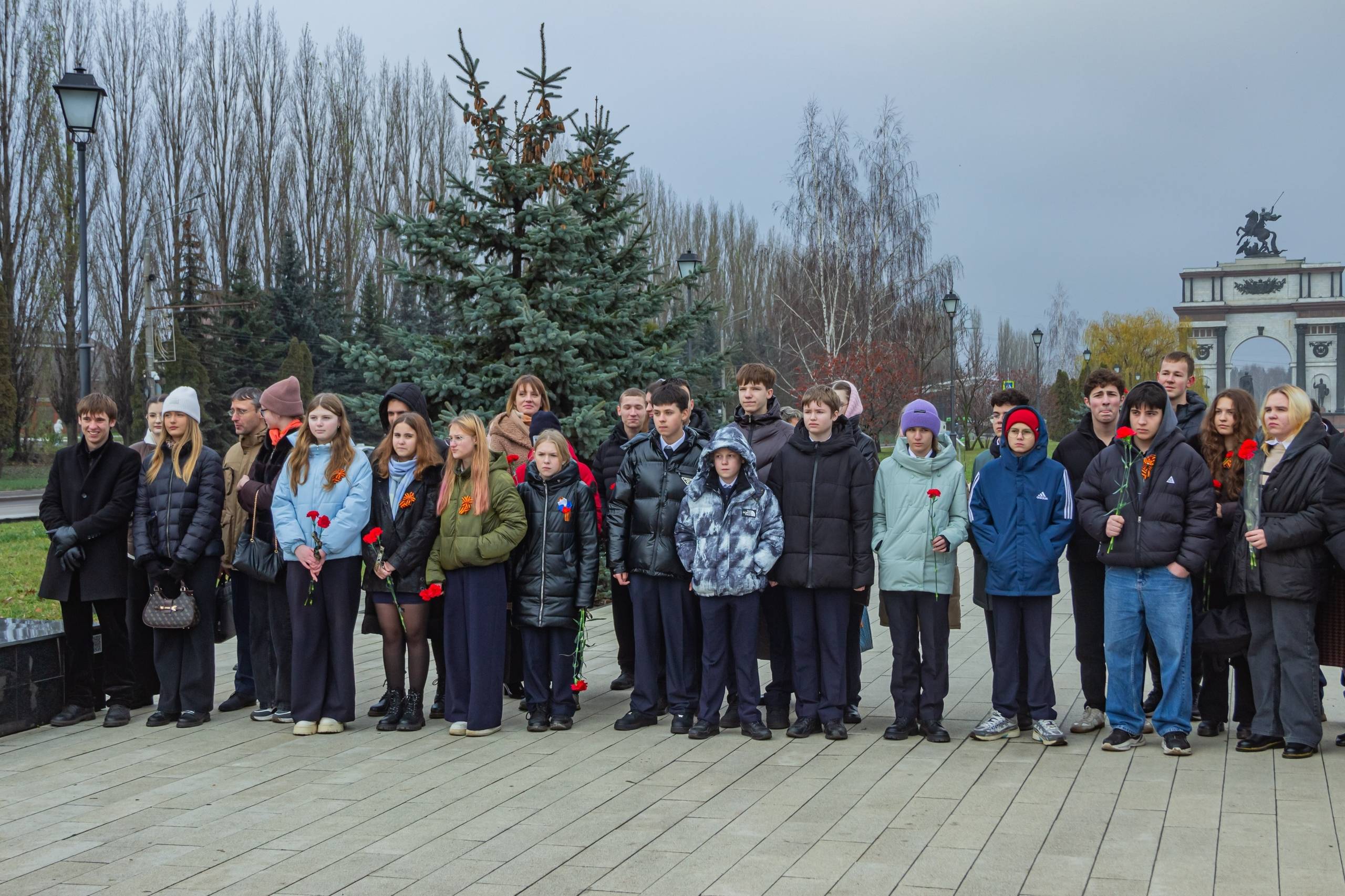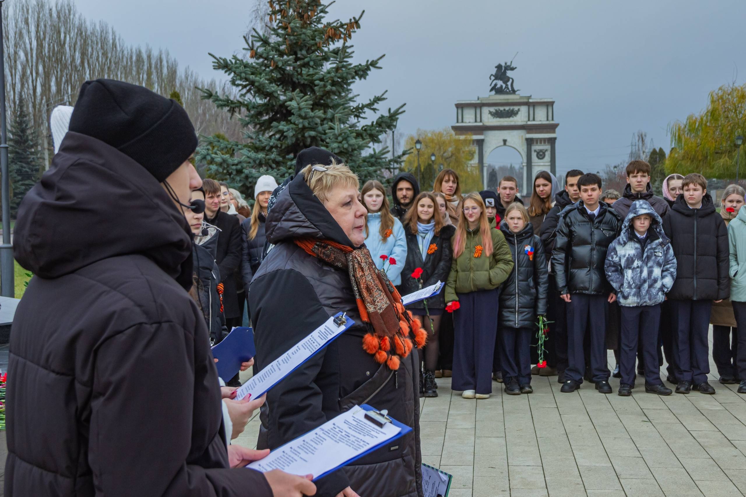 Мероприятие состоялось на мемориальном комплексе «Курская дуга». У вечного огня на гранитном надгробии «Неизвестному солдату Курской земли» собрались активисты школьных музеев города Курска – участники городской воспитательной программы «Наследие предков в достойных руках». Руководитель – член Российского военно-исторического общества Лариса Веретенникова.