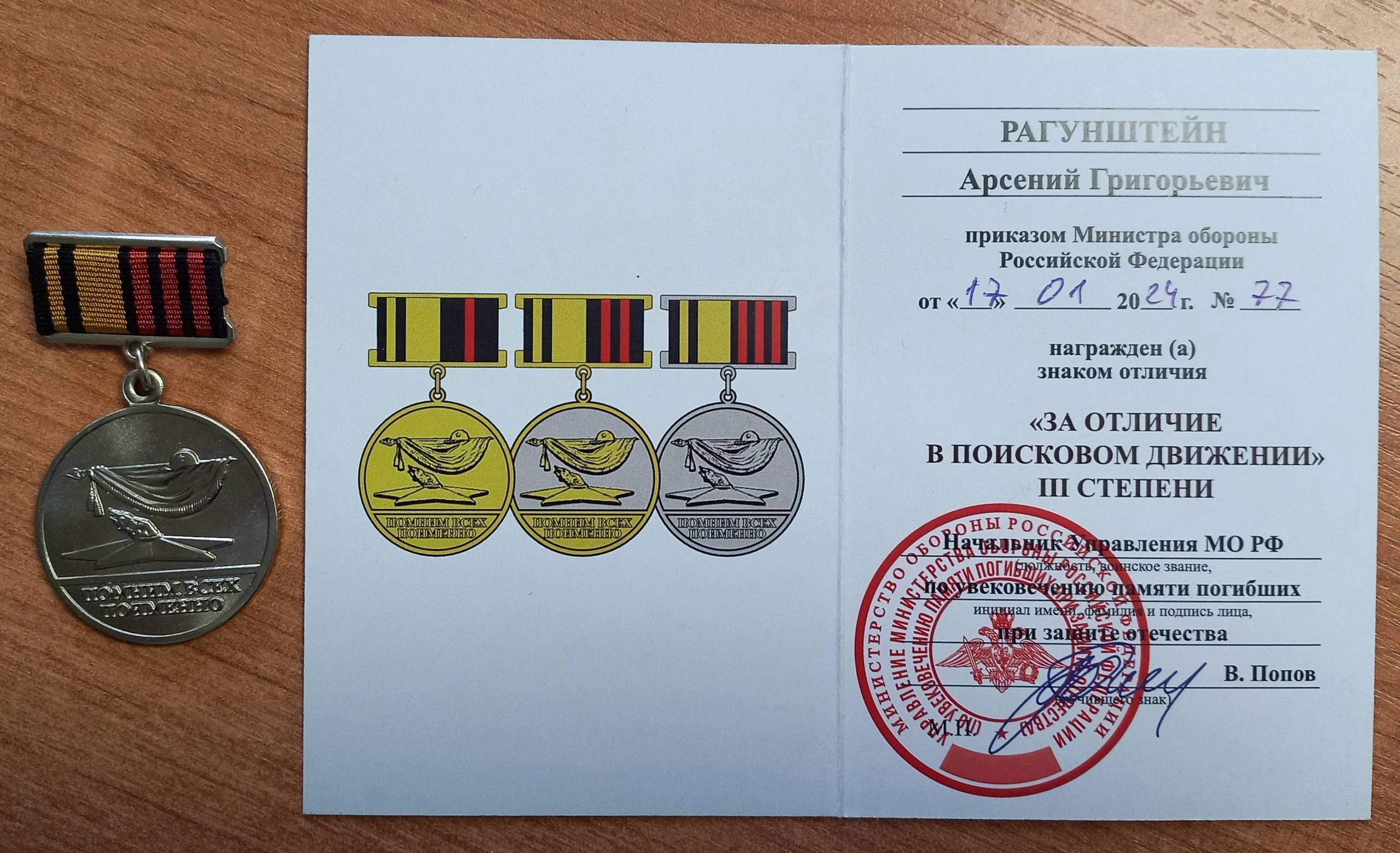 Активист регионального отделения РВИО Арсений Рагунштейн награжден знаком Министерства обороны Российской Федерации «За отличие в поисковом движении» III степени