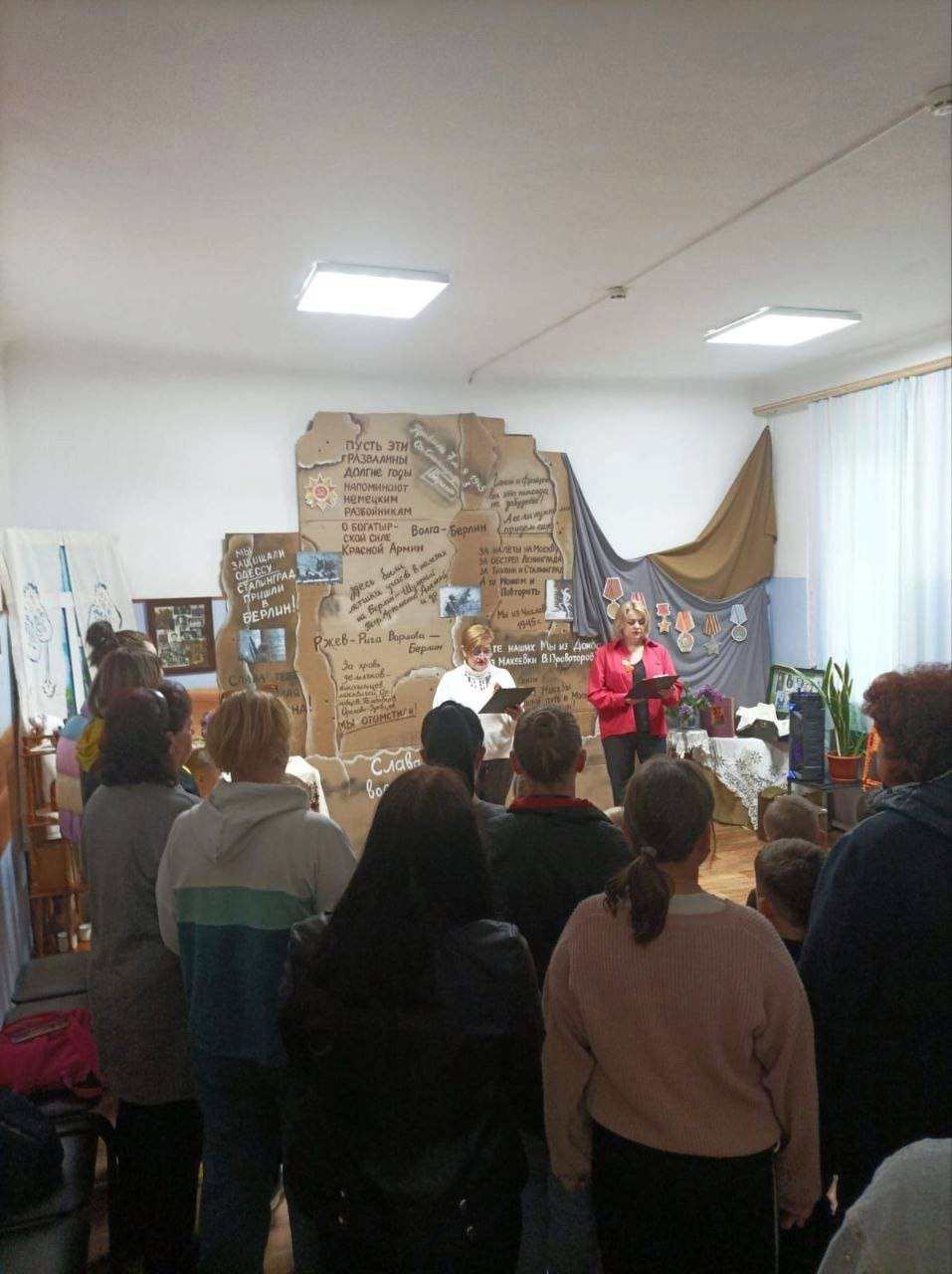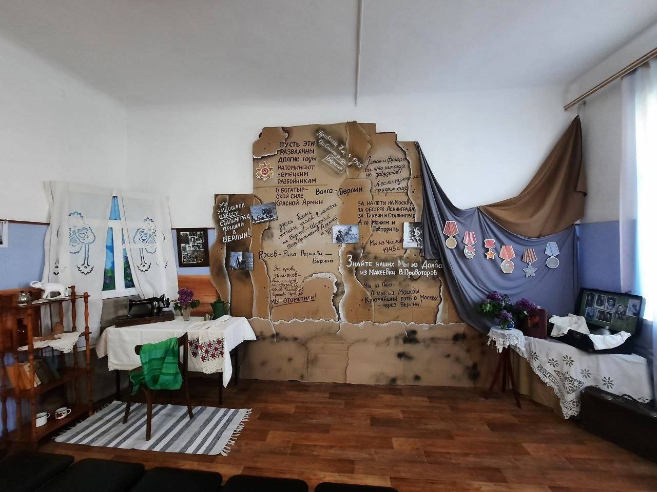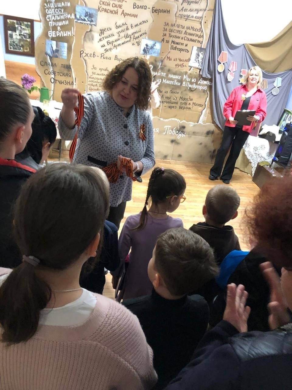 Педагоги создали трогательную экспозицию с элементами интерьера военных лет, воспроизвели макет стены Рейхстага с надписями советских солдат-победителей. Ребята увидели копию Знамени Победы, портреты героев Бессмертного полка. Минутой молчания почтили память погибших, завершили митинг песней «День Победы» и вручили детям георгиевские ленточки.