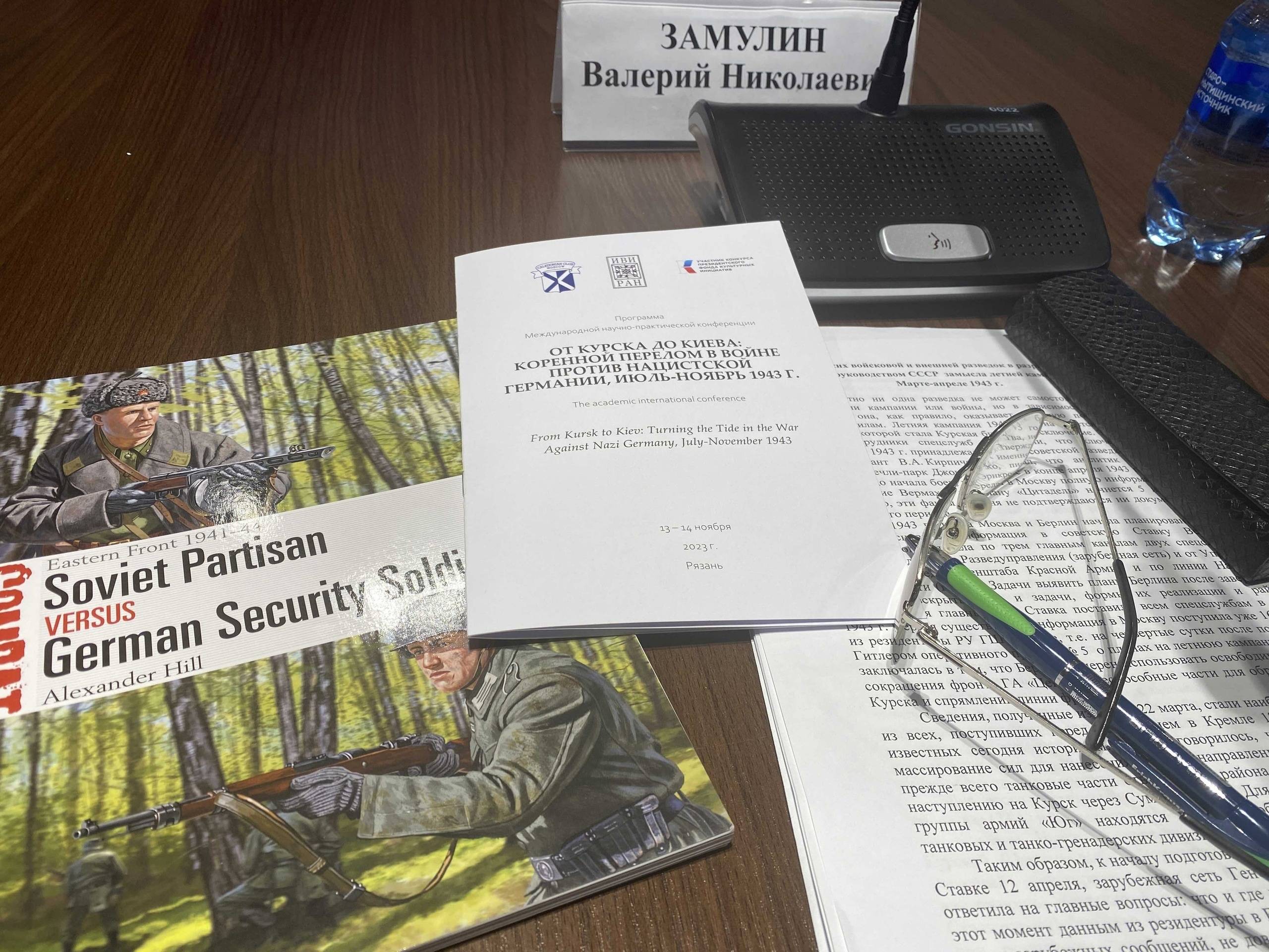 Свой доклад представил член регионального отделения РВИО в Курской области, ведущий научный сотрудник ЮЗГУ, историк и писатель Валерий Замулин. Его выступление посвящалось вкладу советской войсковой и внешней разведок в разработку замысла летней кампании 1943 года военно-политическим руководством СССР.