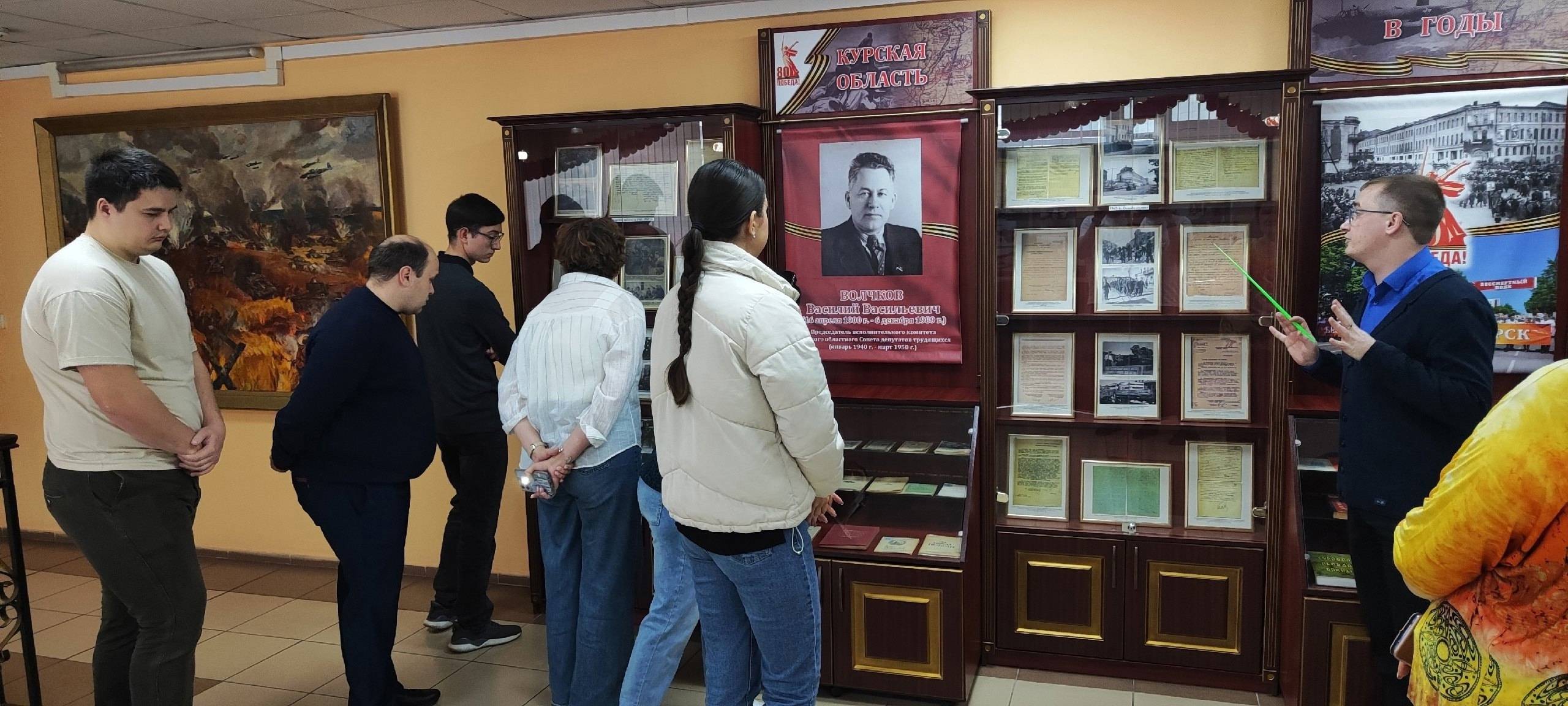 Гости увидели архивные материалы о начале мобилизации в Курской области, о создании боевых истребительных подразделений и партизанских отрядов, об освобождении региона от немецко-фашистских войск, подготовке к Курской битве и последующей мирной жизни на бывших оккупированных территориях. Олег Николаевич представил экскурсантам документальные свидетельства и фотоматериалы, посвященные празднику Великой Победы в Курской области начиная с 9 мая 1945 года до середины 1990-х годов. Сотрудники выставочного центра «Курск – Город воинской славы» также изучили архивные записи преступлений немецких оккупационных властей на территории Курской области.