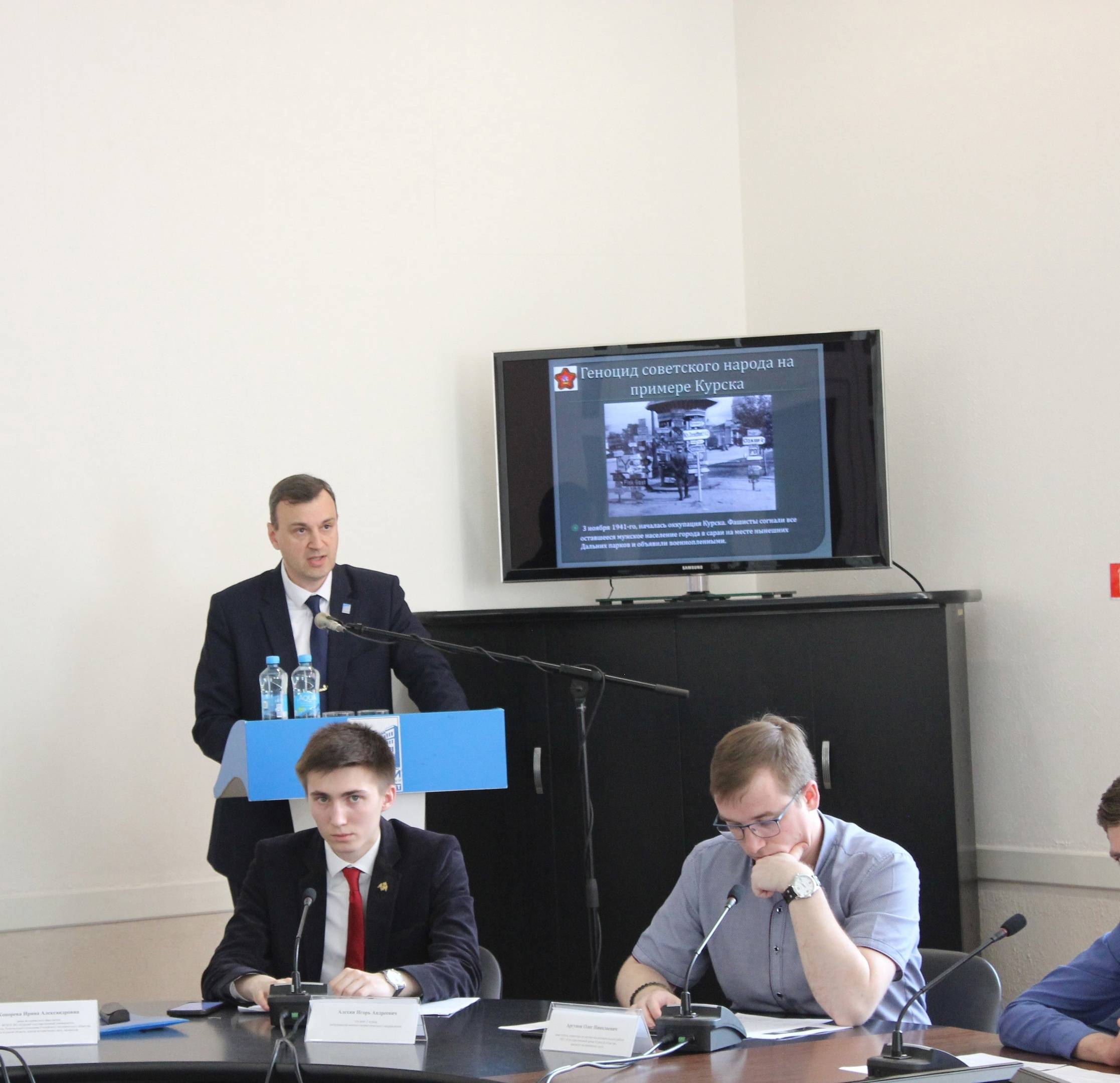 С опытом работы курских поисковиков в проекте «Без срока давности» присутствующих познакомил Арсений Рагунштейн – член РО РВИО, руководитель Координационного Центра КГУ, командир поискового отряда «Курская дружина».