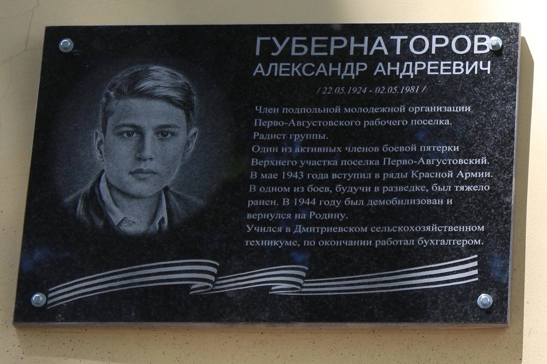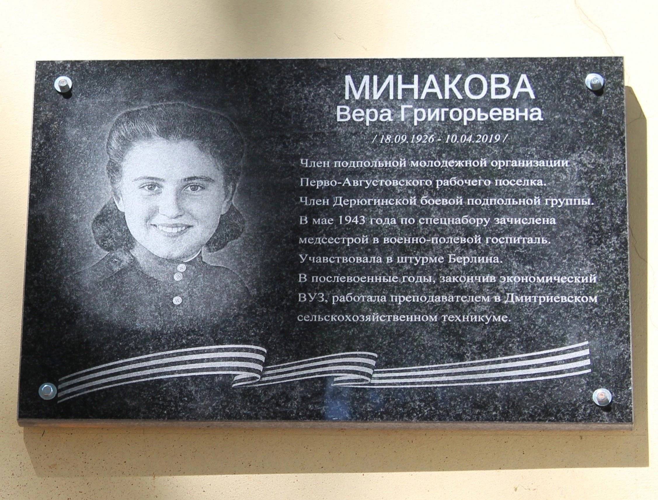 На здании агротехнологического колледжа в городе Дмитриеве установили памятные доски, посвященные бывшим подпольщикам Александру Губернаторову и Вере Минаковой. В церемонии открытия приняли участие члены РО РВИО Борис Беспарточный и Лариса Холтобина.