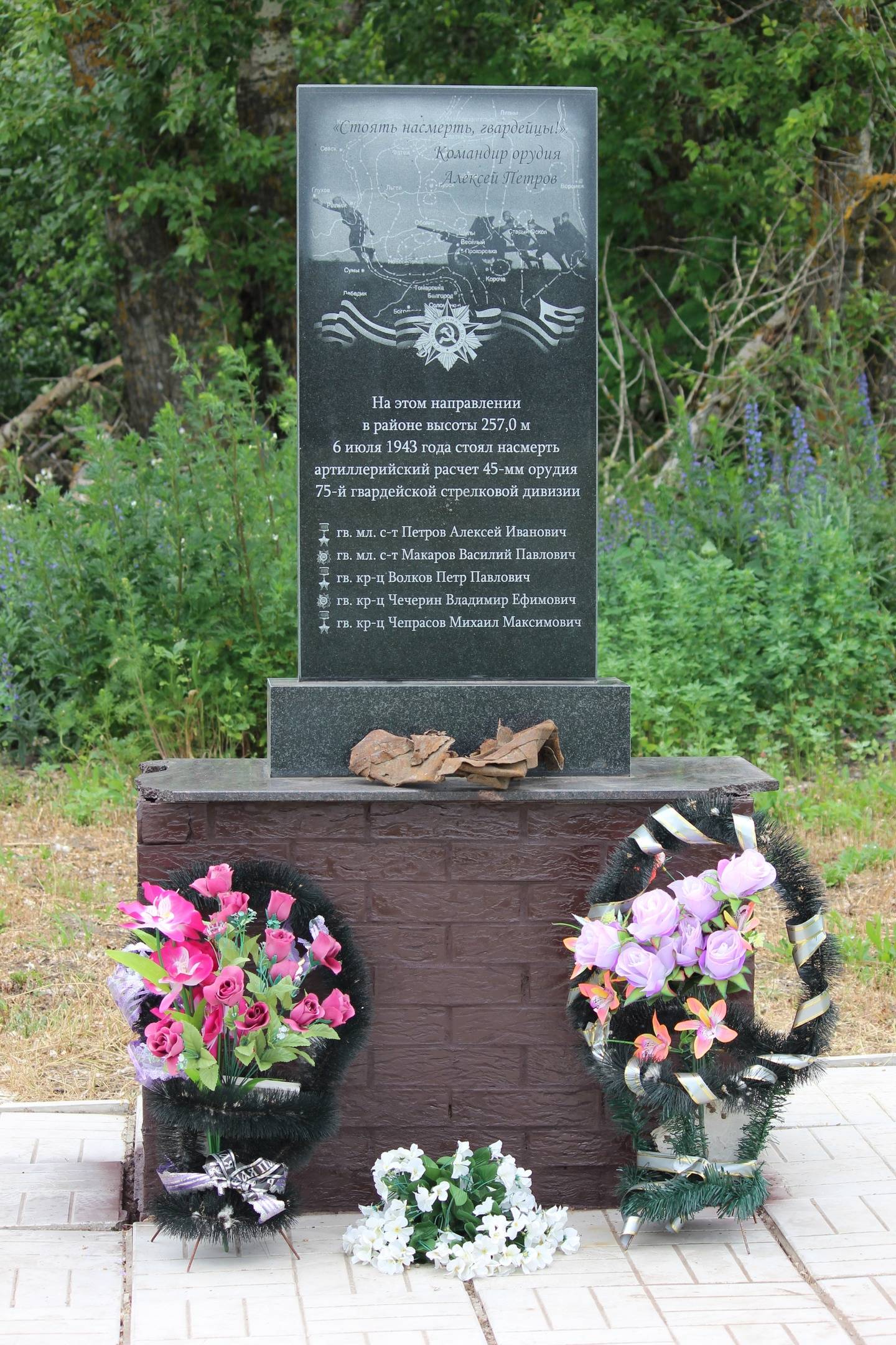 Мемориальная доска установлена по инициативе Председателя Совета РО РВИО в Курской области В.В. Коровина в преддверии 80-летия победы в Курской битве. Ее разместили у памятного знака, который был поставлен в 2017 году членами молодежной организации «Спорадик» ЮЗГУ.