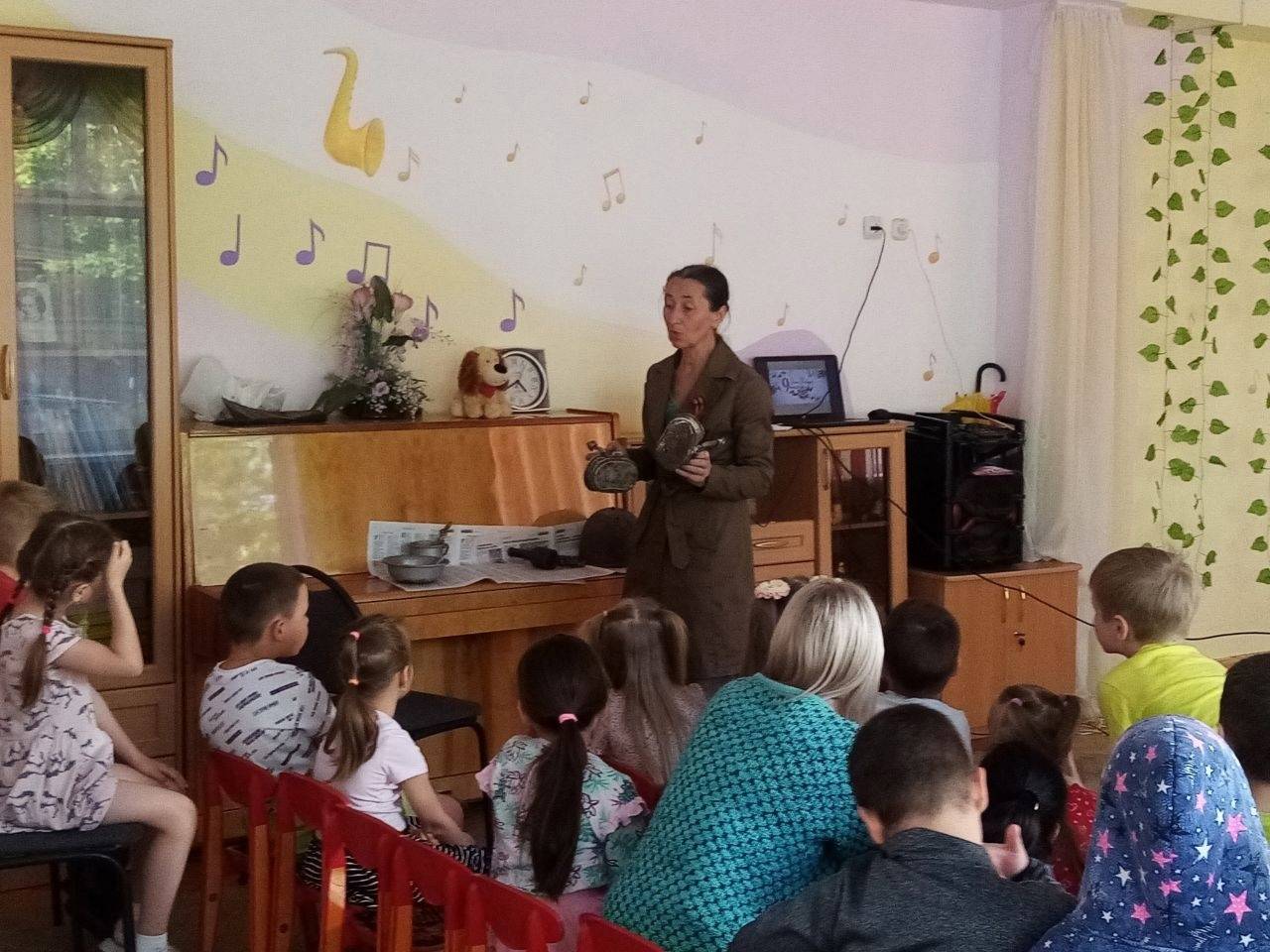 Член Железногорского местного отделения РВИО, научный сотрудник музея «Большой дуб» Ольга Уханкина провела Урок Победы в Детском саду № 19 города Железногорска. Ольга Владимировна рассказала ребятам о значении всенародного праздника – Дня Победы – и показала им подлинные предметы периода Великой Отечественной войны: каску, котелок, фляжку советского воина.