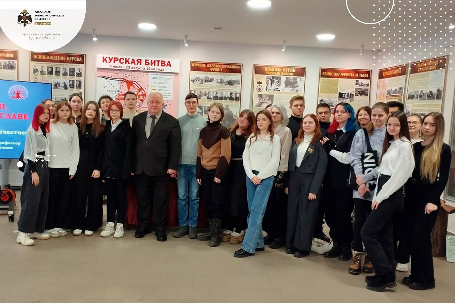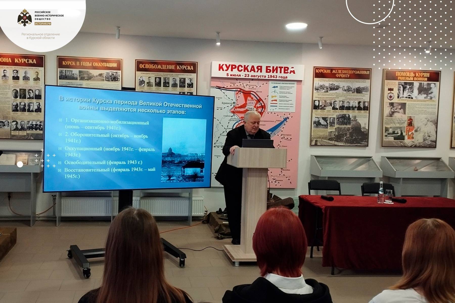 Цикл лекций открыл председатель Совета регионального отделения Российского военно-исторического общества, профессор ЮЗГУ, доктор исторических наук Владимир Коровин. Его выступление было посвящено теме «Курск в годы Великой Отечественной войны». Владимир Викторович поделился с ребятами информацией о событиях того времени.