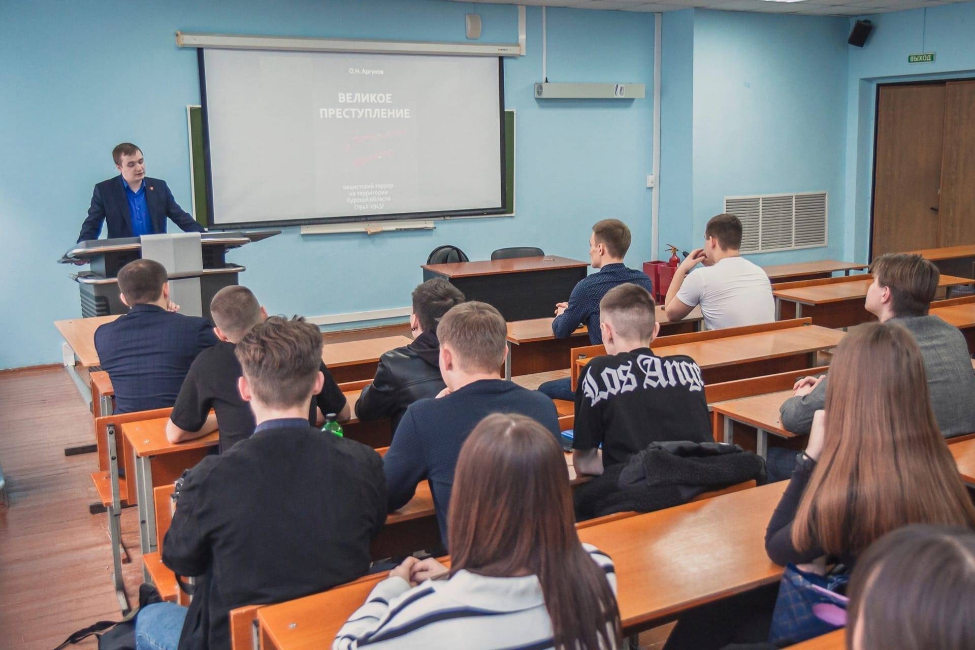 В рамках Дня единых действий перед студентами юридического факультета ЮЗГУ выступил член РВИО, начальник отдела научно-исследовательской работы и информационного обеспечения Госархива Курской области О.Н.Аргунов.