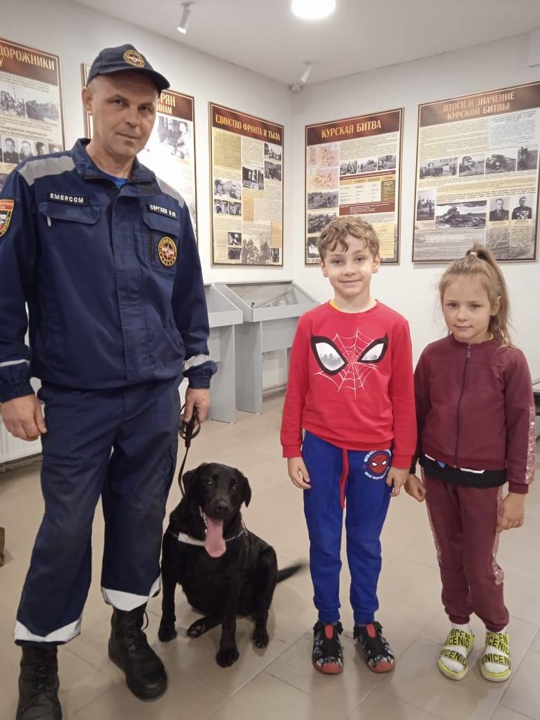 Еще одним участником встречи стала лабрадор Лаки – член кинологической группы аварийно-спасательной службы Курской области. О работе собак на службе в Курске рассказали начальник кинологической группы Анатолий Васильевич Кузякин и кинолог Виталий Сергеев. Лаки исполнила все команды общего курса дрессировки, включая нахождение взрывчатого вещества среди нескольких объектов.