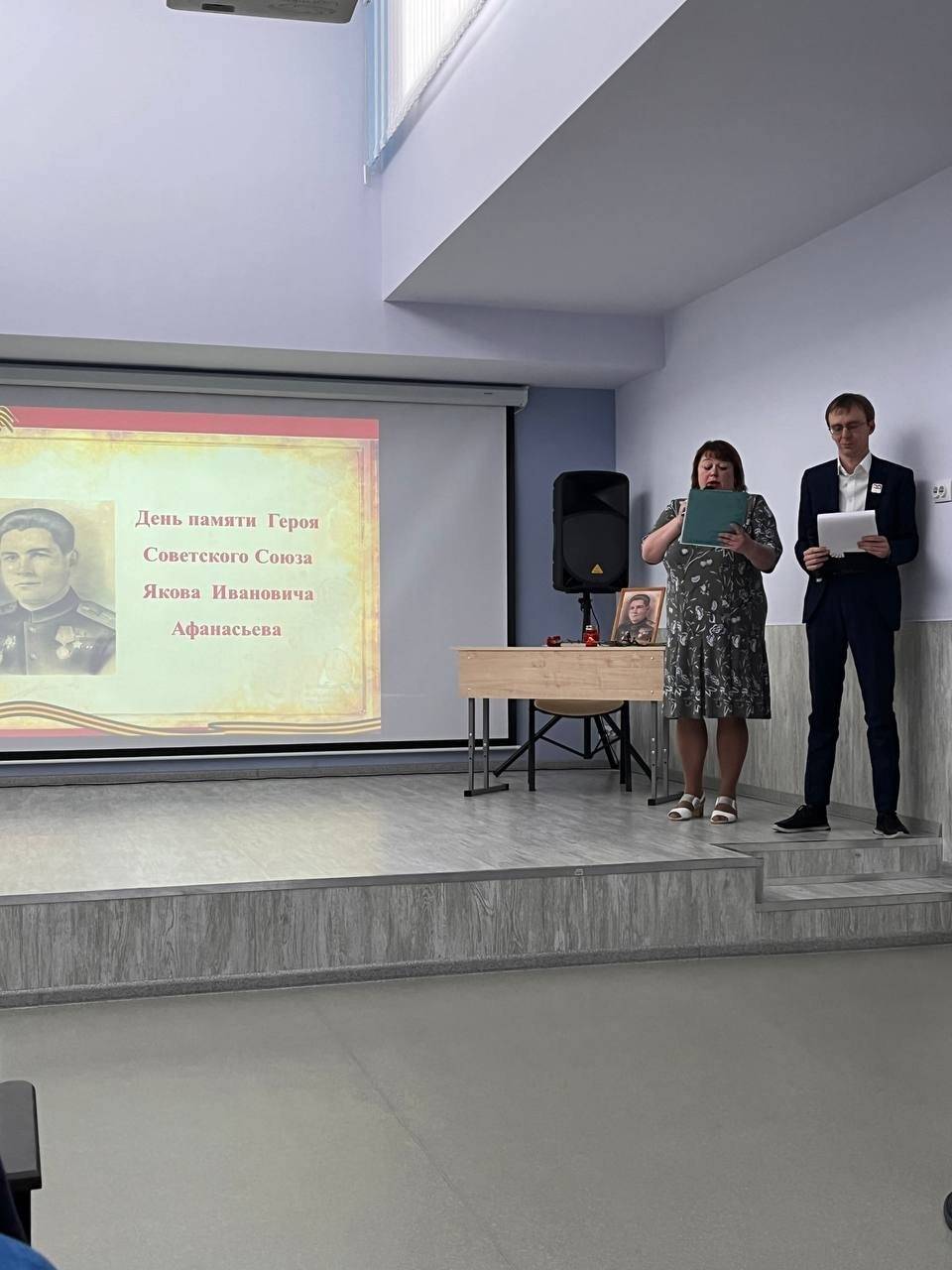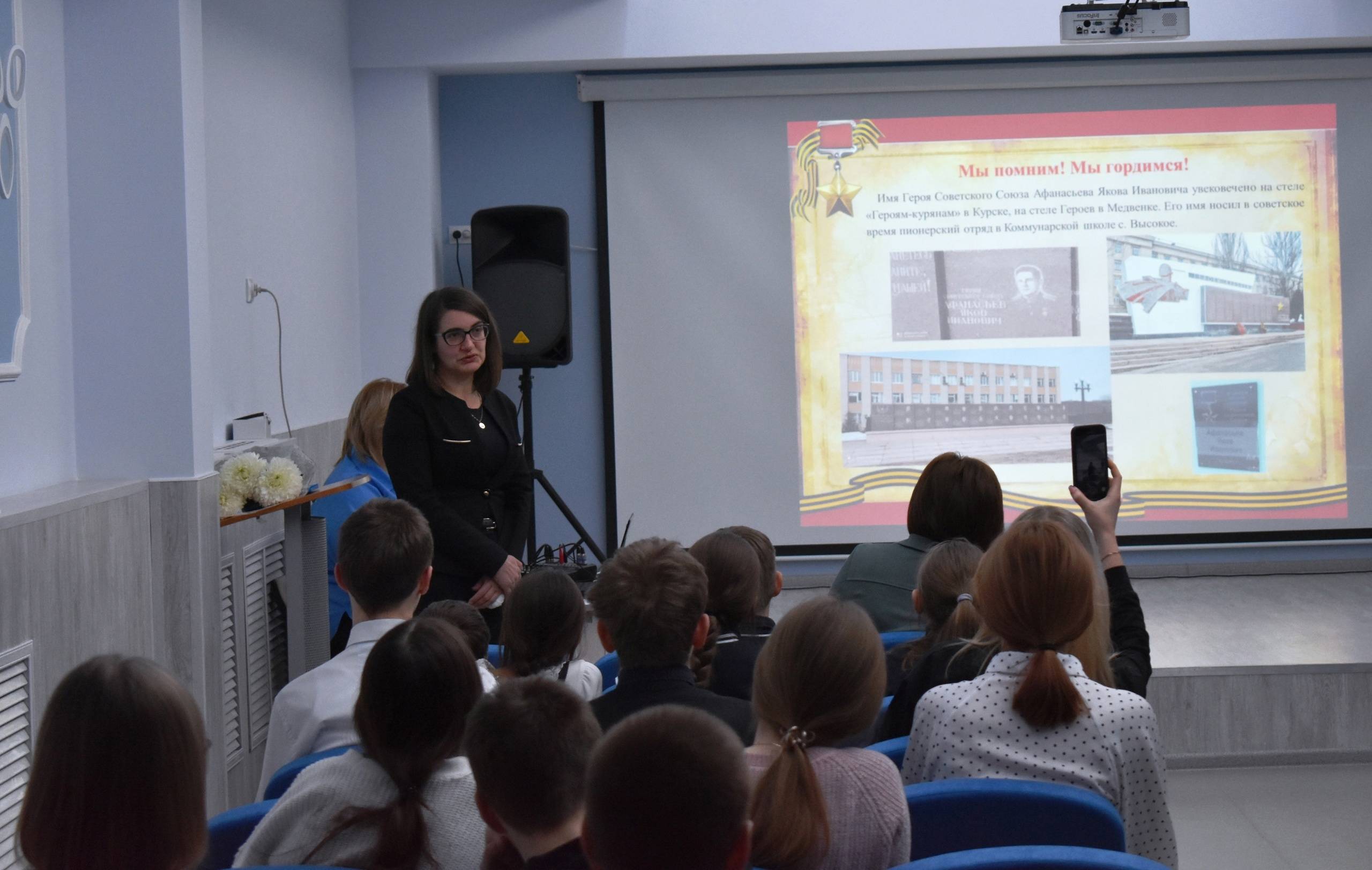 На базе МОКУ «Высоконодворская средняя общеобразовательная школа имени трижды Героя Советского СоюзаИ.Н. Кожедуба» для учащихся 5-11 классов, педагогического коллектива прошло внеклассное мероприятие «День памяти земляка Героя Советского Союза Якова Ивановича Афанасьева». Инициатором мероприятия выступил председатель Медвенского местного отделения РВИО, учитель истории Бутенко Евгений Николаевич. 24 июля 2024 года будет знаменательная дата -105 лет со дня его рождения. А 16 января – День Памяти Героя. В этот день от тяжелого ранения Герой Советского Союза командир танковой роты гвардии старший лейтенант 6-го гвардейского танкового корпуса 3-й гвардейской танковой армии Яков Иванович Афанасьев скончался в госпитале в г. Пшедбуж (Польша). Ведущая - учитель Кузнецова Е.В. вместе сучастниками исследовательских проектов ученицей 11 класса Кубаревой Дарьей и учеником 6 класса Алтуховым Андреем рассказали о боевом пути Якова Ивановича, его подвиге. В зале звучали стихи, демонстрировалась военная хроника.Учащиеся 9 класса инсценировали «Рассказ о нашем земляке», опубликованный в районной газете «Заря коммунизма» от 3 апреля 1975 г. В качестве почетного гостя на мероприятии присутствовала внучатая племянница Героя Елена Николаевна Агапова. Она рассказала присутствующим о семье своего родственника, показала фотоальбом, медали. Минутой молчания почтили память Якова Ивановича. Мероприяти езавершилось песней «Журавли» (музыка Яна Френкеля, слова Расула Гамзатова) в исполнении учителя Иванченко Н.В.