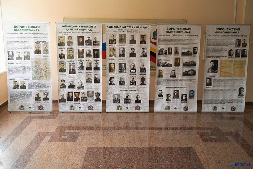 На выставке представлены портреты всех командиров стрелковых дивизий и бригад, действовавших в это время на территории Курской области. Здесь же сведения о танковых корпусах и бригадах, воевавших в полосе Брянского и Юго-Западного фронтов, где отличились бойцы бронепоездов И.В. Уваров, Н.Д. Сиукаев, В.Я. Куплевахский, А.В. Черевко, П.С. Шубин и многие другие.