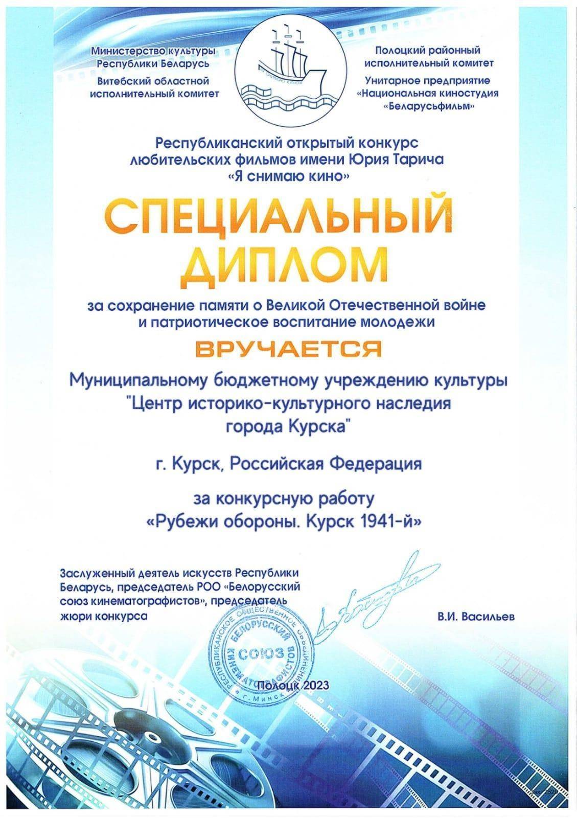 В Полоцке наградили финалистов Х республиканского открытого конкурса любительских фильмов имени Юрия Тарича «Я снимаю кино». В этом году на нем представили 130 работ из Беларуси, России и Германии. Картина «Рубежи обороны. Курск 1941» Центра историко-культурного наследия получила специальный диплом за сохранение памяти о Великой Отечественной войне и патриотическое воспитание молодежи.