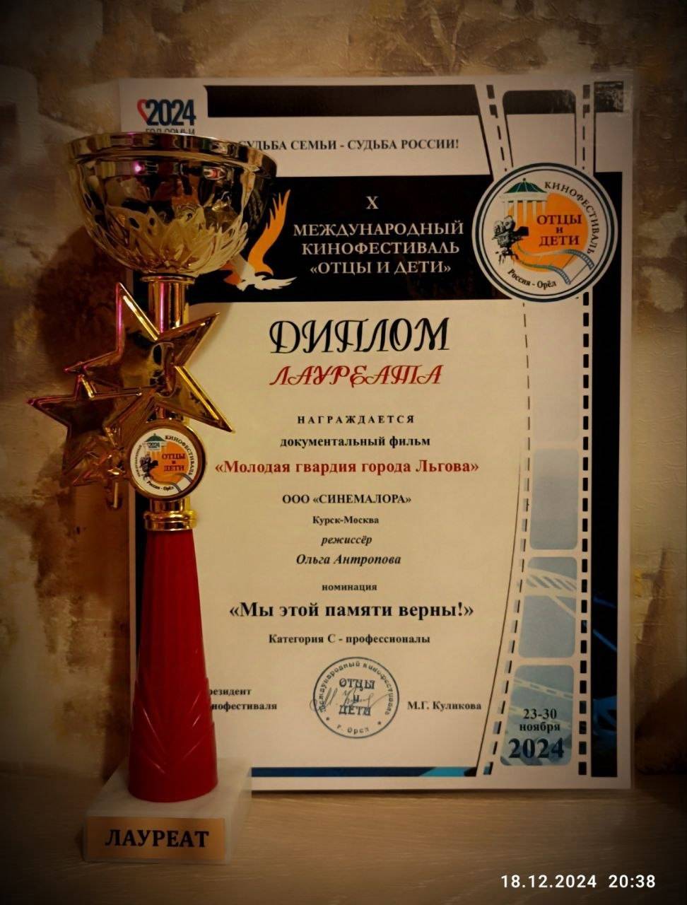 В Доме кино в Москве прошло награждение лауреатов X юбилейного Международного кинофестиваля «Отцы и дети». Он направлен на сохранение лучших традиций национальной культуры, русского языка, патриотизма через преемственность поколений посредством киноискусства. Лауреат в номинации «Мы этой памяти верны!» – документальный фильм Ольги Антроповой «Молодая гвардия города Льгова».