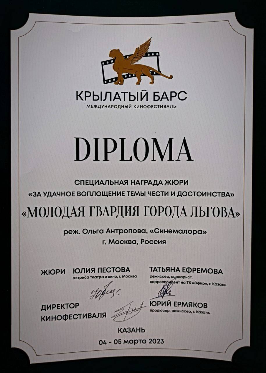 4-5 марта 2023 года в Казани проходил международный кинофестиваль «КРЫЛАТЫЙ БАРС». Картина «Молодая гвардия города Льгова», производства студии «СИНЕМАЛОРА» под руководством нашей землячки Ольги Антроповой удостоилась специальной награды жюри «За удачное воплощение темы чести и достоинства». В съемках фильма, посвященного истории льговской подпольной молодежной организации, боровшейся с оккупантами и их пособниками на курской земле в 1941-1942 годах, принимали участие представители регионального отделения РВИО В.В. Коровин, А.Н. Манжосов, А.В. Секерин.