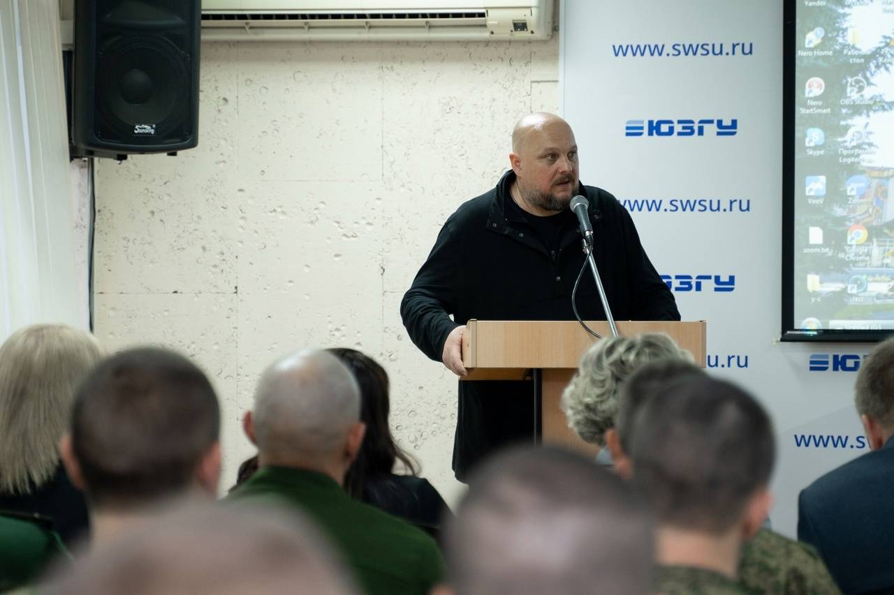 Апти Алаудинов говорил о роли России в современном мире, причинах противостояния с Западом, значимости исконных культурных ценностей и личной ответственности каждого за будущее страны. Михаил Матросов рассказал о работе в кинематографе и общественной деятельности, а также представил свой фильм «Во имя мира на земле» об особой автомобильной роте Президентского полка. Почетные гости осмотрели экспозицию музея ЮЗГУ, побывали в военном учебном центре и пообщались с преподавателями ВУЦ.