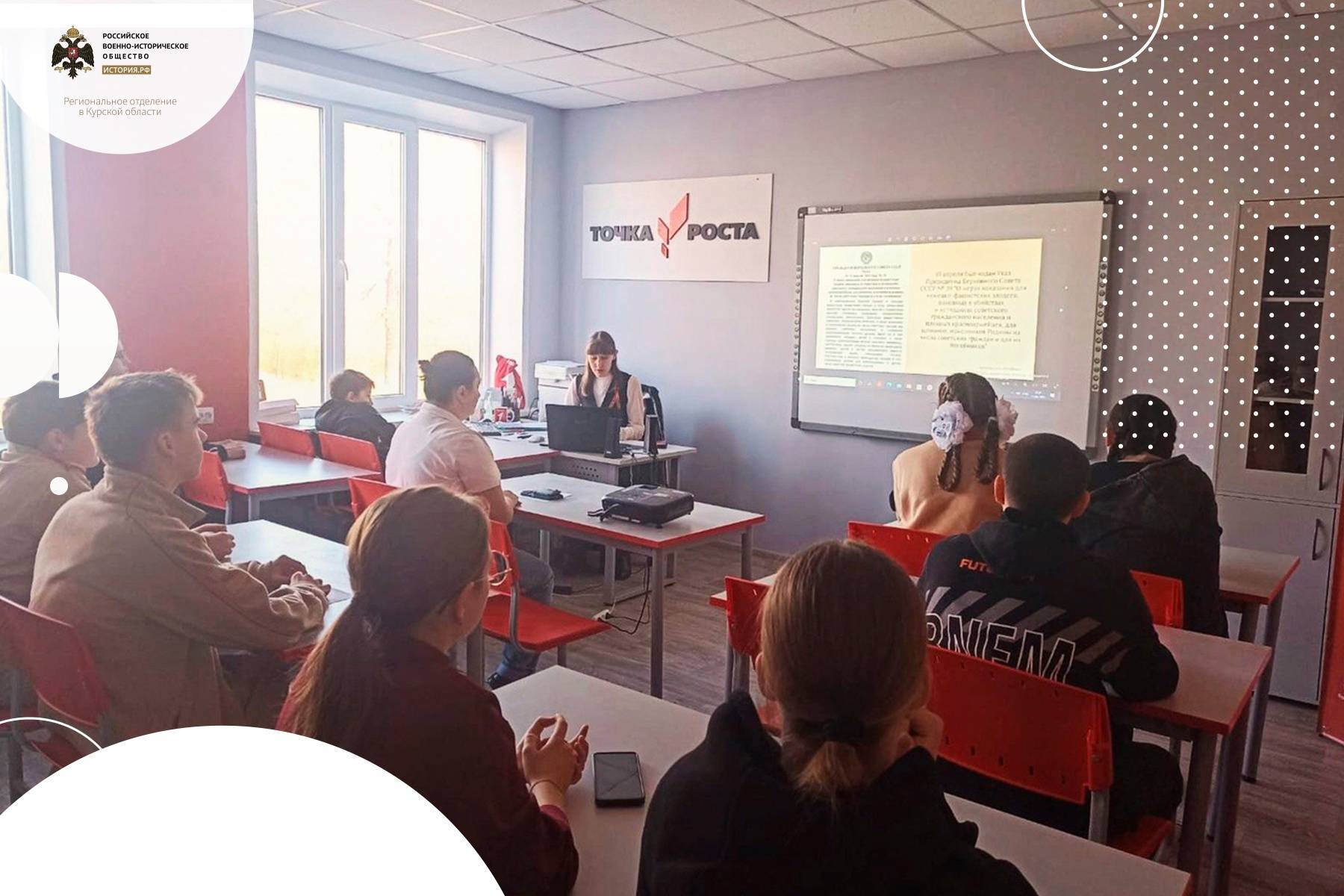 Патриотическую встречу с ребятами из Рышковской школы провела Анастасия Мальцева – председатель Железногорского местного отделения Российского военно-исторического общества, старший научный сотрудник музея партизанской славы «Большой Дуб».