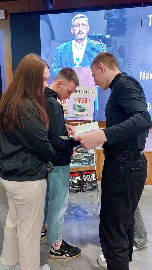 В музее «Битва за оружие Великой Победы» ребят ожидала творческая встреча с писателем и военным историком Максимом Коломийцем, специально приехавшим из Москвы, чтобы поделиться с молодежью новейшими наработками по истории Прохоровского сражения, основанными на детальном изучении документов военного времени и воспоминаний участников боев.