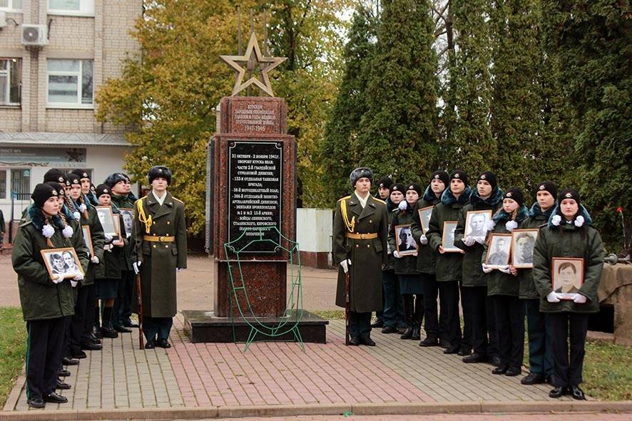 У памятного знака «Погибшим курским ополченцам» – почетный караул из числа юнармейцев Поста № 1, в руках многих из них портреты, сохранившие для горожан образы их защитников, оборонявших Курск и его окрестности в октябре – ноябре 1941 года.