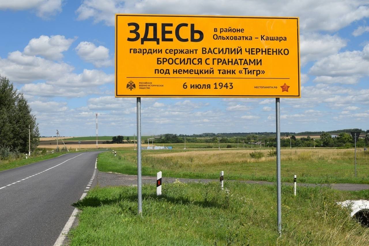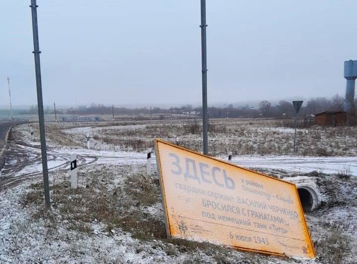 Один из 15 курских «Маяков памяти» находился у села Ольховатка и был посвящен подвигу Героя Советского Союза Василия Черненко. Но ветреная погода на знаменитых Тепловских высотах, долго испытывая конструкцию на прочность, все же привела к поломке узлов крепления. В результате полотно памятного дорожного знака отделилось от опор и оказалось на земле, о чем с горечью сообщили местные жители.