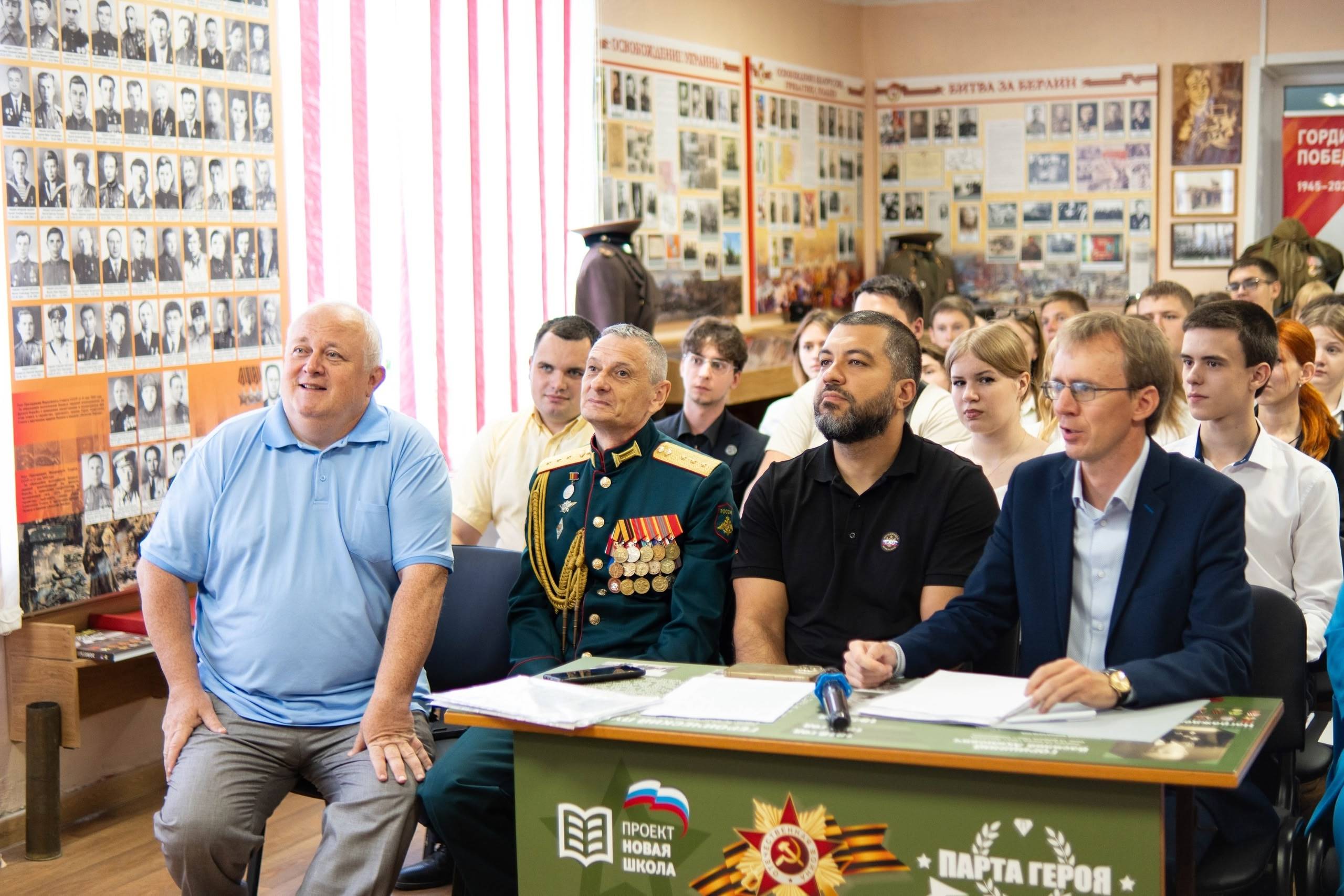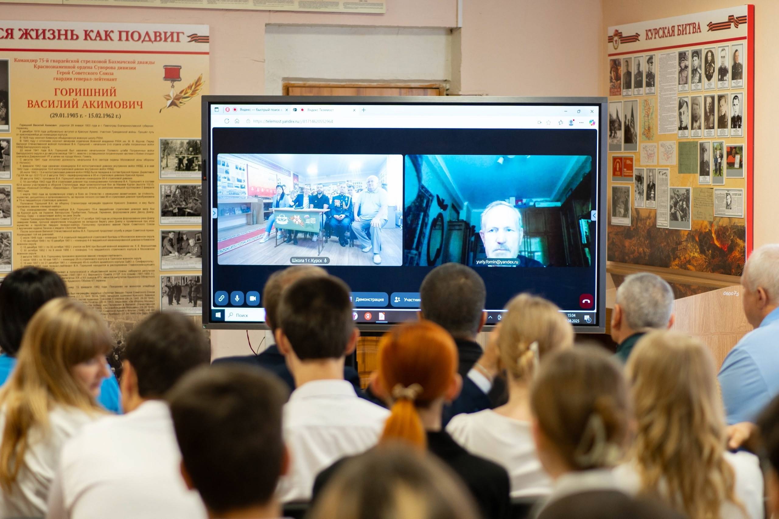 На базе музея боевой славы 75-й гвардейской стрелковой дивизии, действующего при школе №1 областного центра, прошел межрегиональный телемост, посвященный 82-йгодовщине победы в Курской битве. На мероприятии присутствовали старшеклассники и сотрудники образовательного учреждения, члены РО РВИО председатель ассоциации ветеранов СВО Курской области Дмитрий Гулиев, председатель Совета РО РВИО, профессор ЮЗГУ Владимир Коровин, директор музея школы Олег Якунин, председатель Медвенского местного отделения РВИО Евгений Бутенко, преподаватель ЮЗГУ Павел Потапенко.