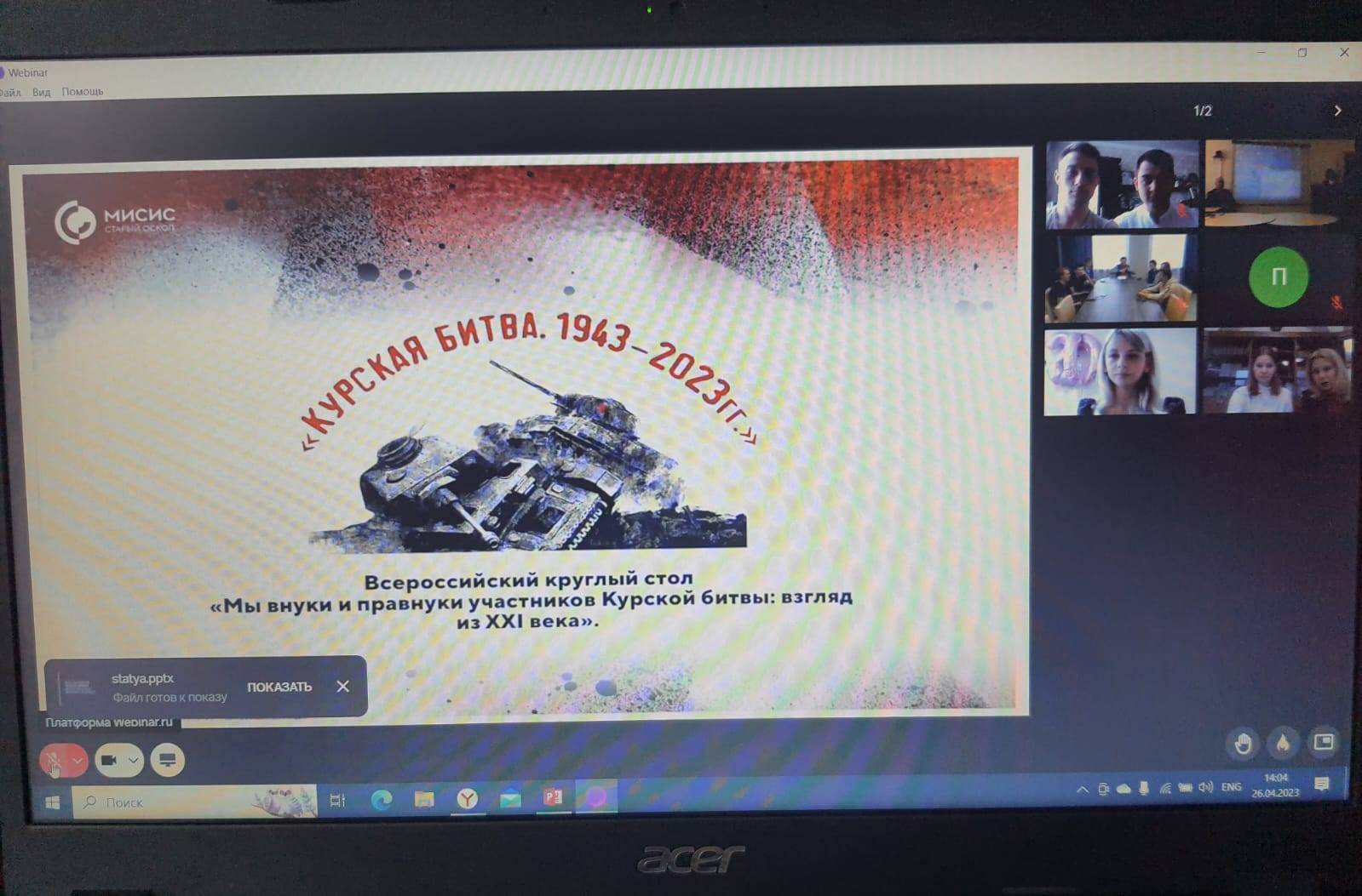 26 апреля 2023 года кафедра гуманитарных наук Старооскольского института НИТУ «МИСИС» под руководством профессора З.З.Мухиной провела для студентов высших и средних профессиональных образовательных организаций России онлайн круглый стол «Мы внуки и правнуки участников Курской битвы: взгляд из XXI века».