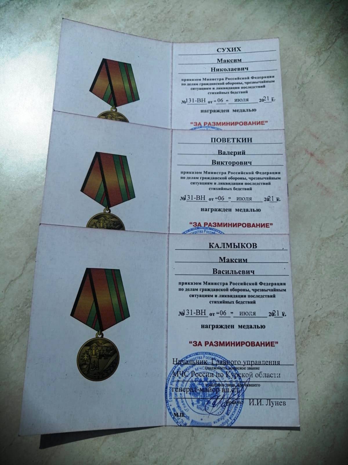 12 мая 2022 года по сообщению члена Совета регионального отделения РВИО, руководителя Центра «Поиск» И.П. Цуканова, начальник Главного управления МЧС России по Курской области И.И. Лунев вручил бойцам поискового отряда «Высота» (г. Курчатов) Калмыкову Максиму Васильевичу, Поветкину Валерию Викторовичу и Сухих Максиму Николаевичу медали МЧС «За разминирование».