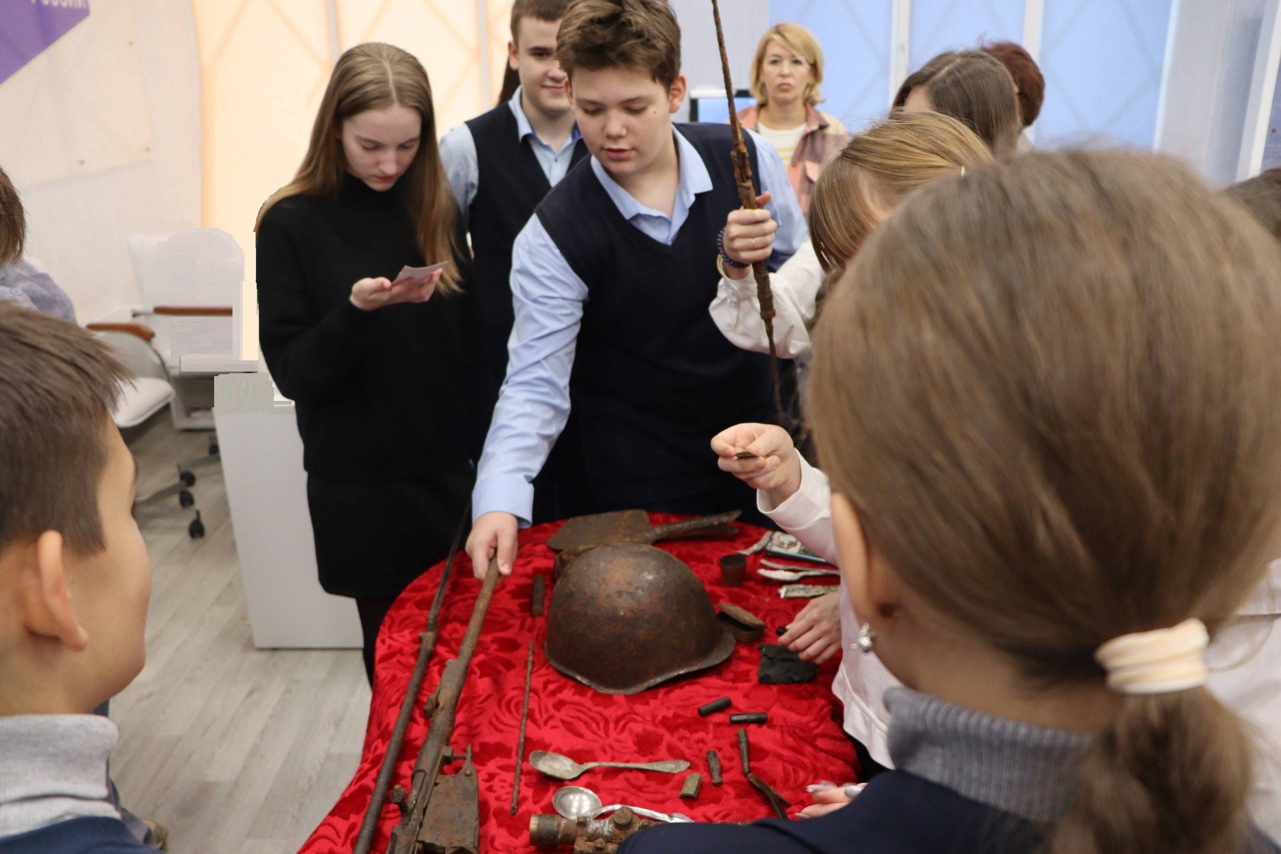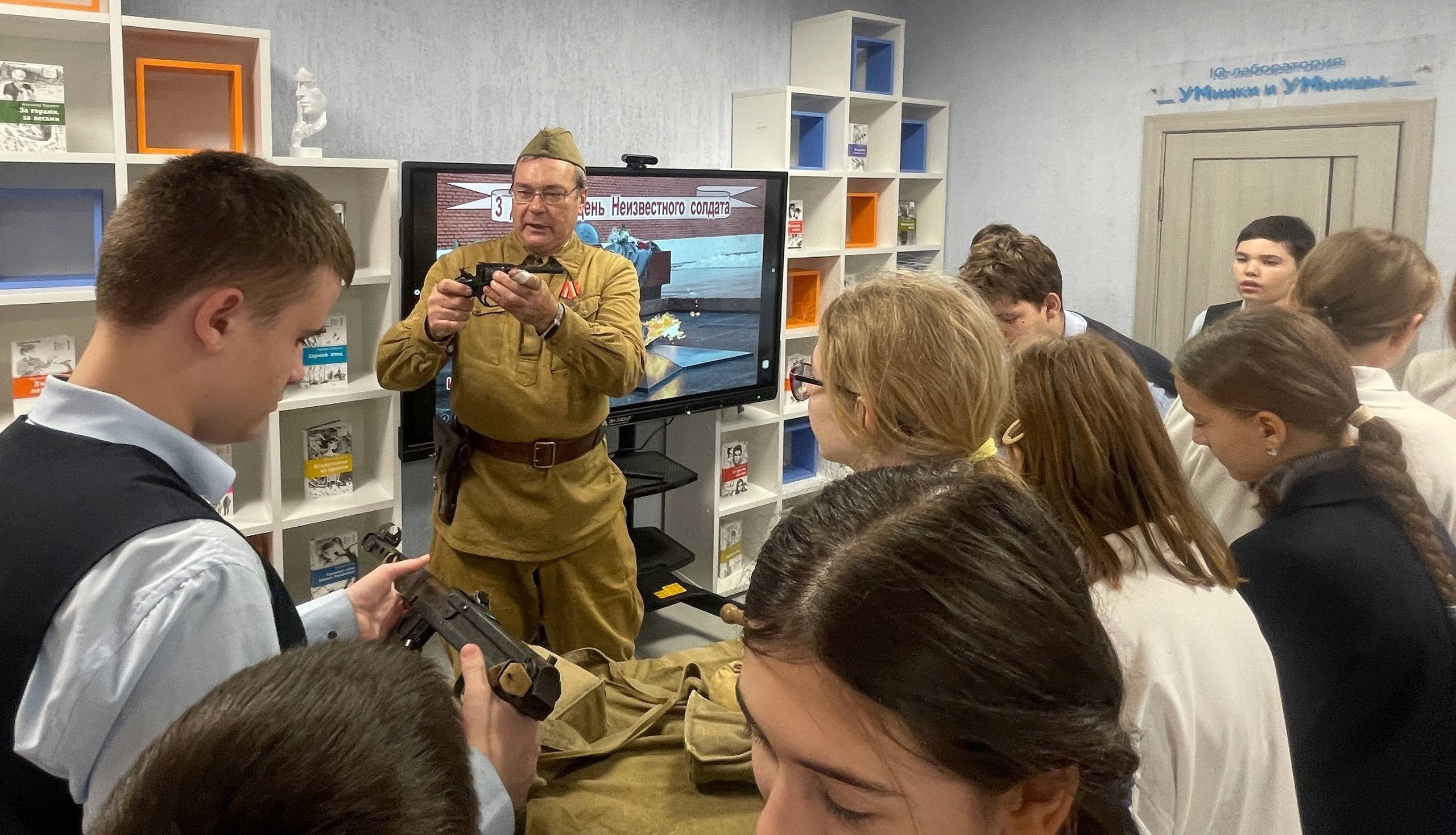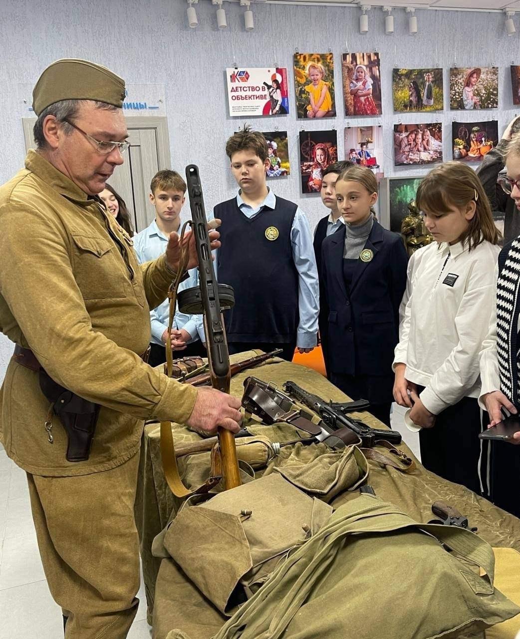 Специальным гостем мероприятия стал Виктор Ефименко – член Российского военно-исторического общества, боец военно-исторического клуба «Курская дуга». Он рассказал школьникам, как создают реконструкции сражений времен Великой Отечественной войны, а также показал оружие и форму советских солдат.