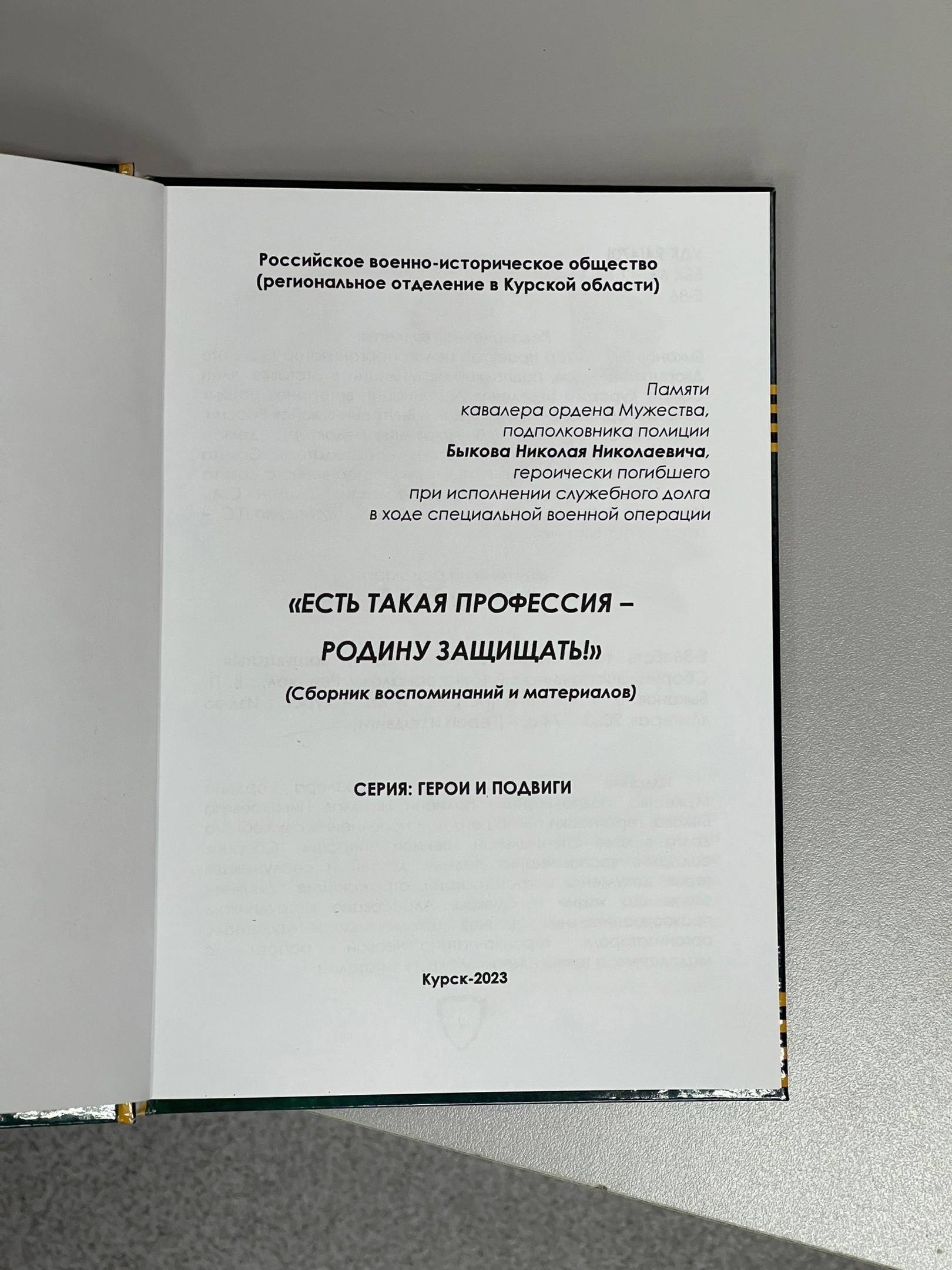 В этот же день региональное отделение РВИО в Курской области презентовало книгу «Есть такая профессия – Родина защищать!» из серии «Герои и подвиги». Это сборник воспоминаний и материалов памяти подполковника полиции Николая Быкова, героически погибшего при исполнении служебного долга в ходе СВО. Издание содержит воспоминания родных, друзей и сослуживцев героя, документы и фотографии, отражающие основные этапы его жизни и службы. Оно адресовано сотрудникам правоохранительных органов, школьникам и студентам, организаторам героико-патриотической работы с молодежью, а также широкому кругу читателей