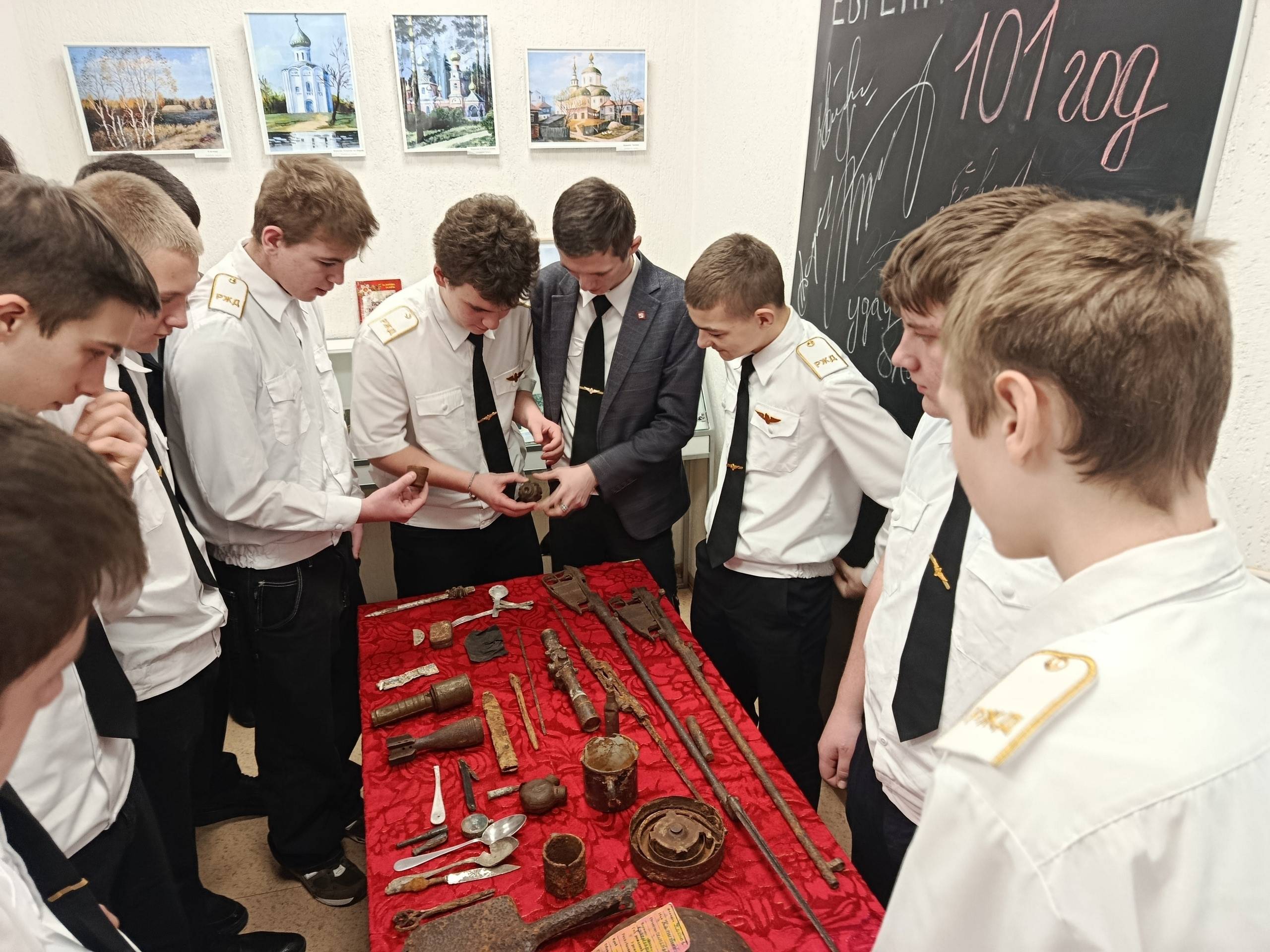 Гостям представили выставку предметов снаряжения, обмундирования и личных вещей участников Великой Отечественной войны, найденных членами поискового отряда «Курская земля» Курской областной молодежной патриотической общественной организации Центра «Поиск» (рук. Елена Сукманова).