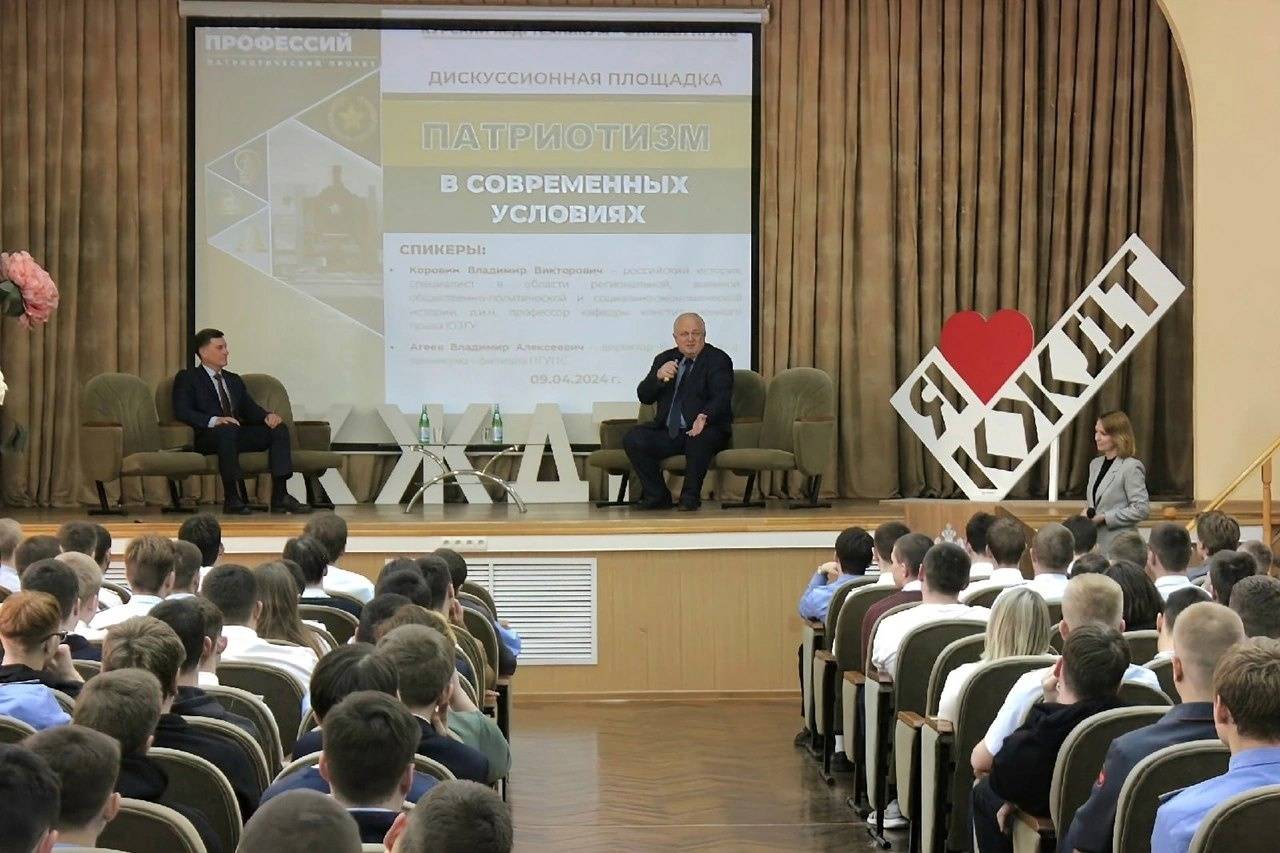 В Курском техникуме железнодорожного транспорта – филиале Санкт-Петербургского государственного университета путей сообщения состоялась дискуссионная площадка «Патриотизм в современных условиях». На актуальные вопросы о сущности современного российского патриотизма старшекурсники вели разговор с председателем Совета регионального отделения РВИО, профессором ЮЗГУ В.В. Коровиным и директором техникума В.А. Агеевым.