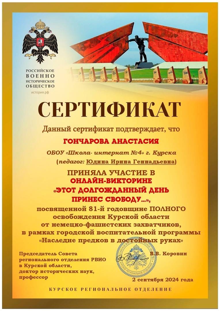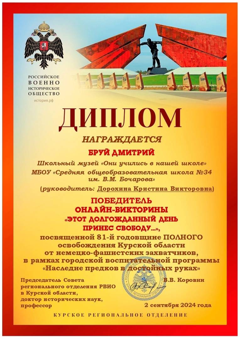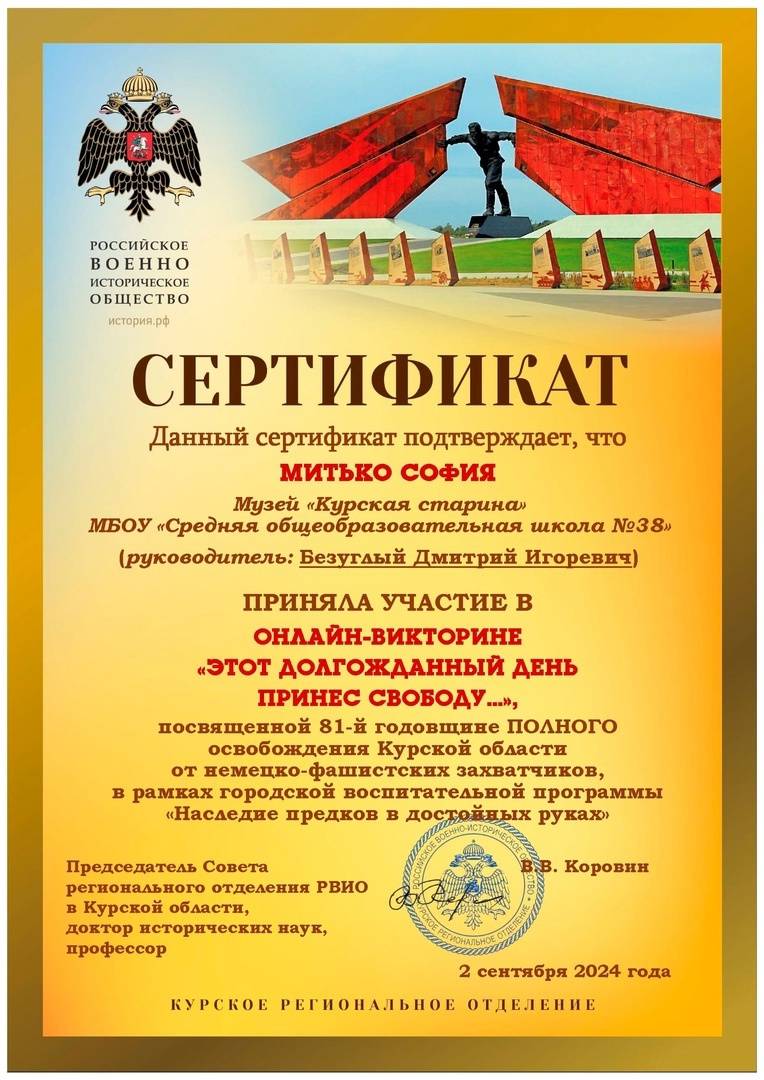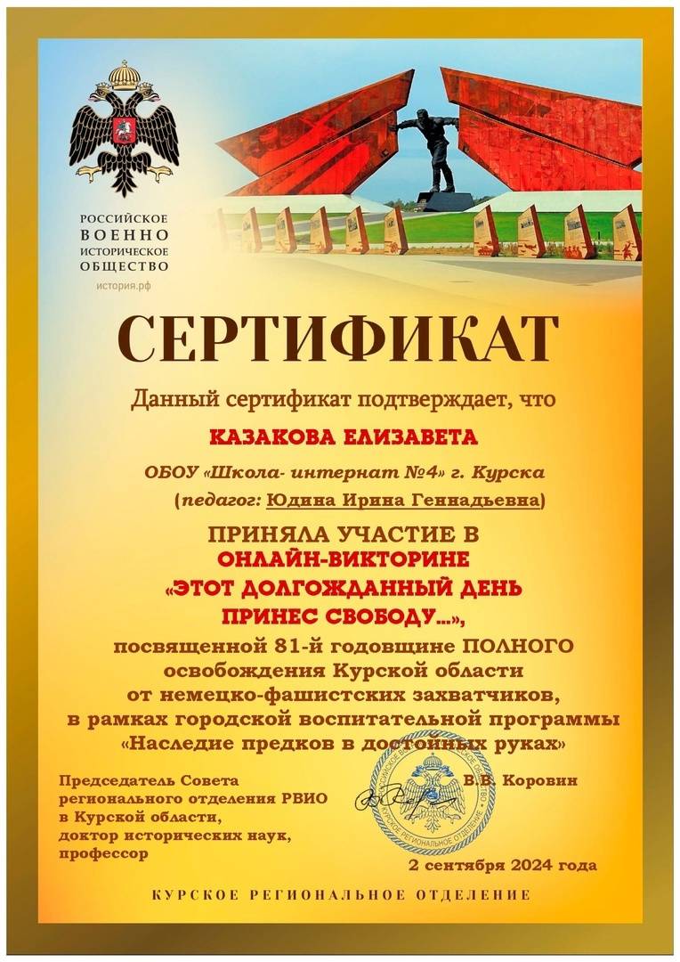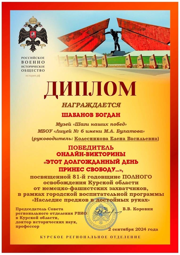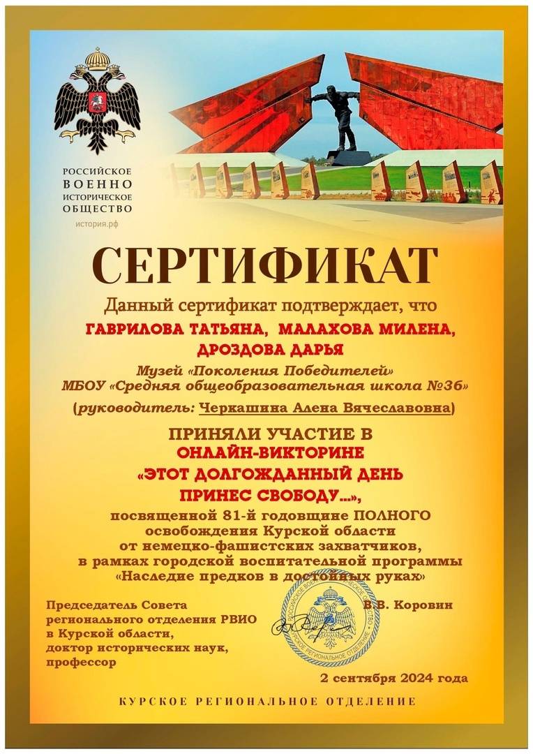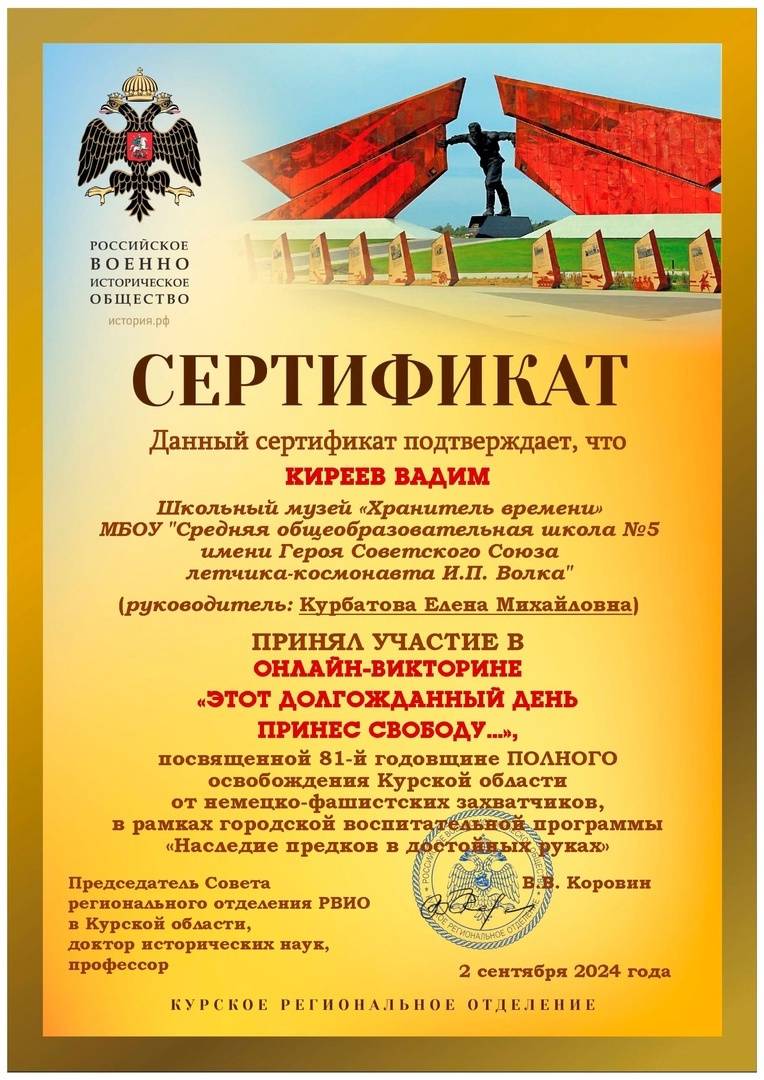 Викторина посвящалась 81-й годовщине полного освобождения Курской области от немецко-фашистских захватчиков. Мероприятие прошло при поддержке Курского регионального отделения Российского военно-исторического общества в рамках городской воспитательной программы «Наследие предков в достойных руках». Руководитель программы – член РВИО Лариса Веретенникова.
