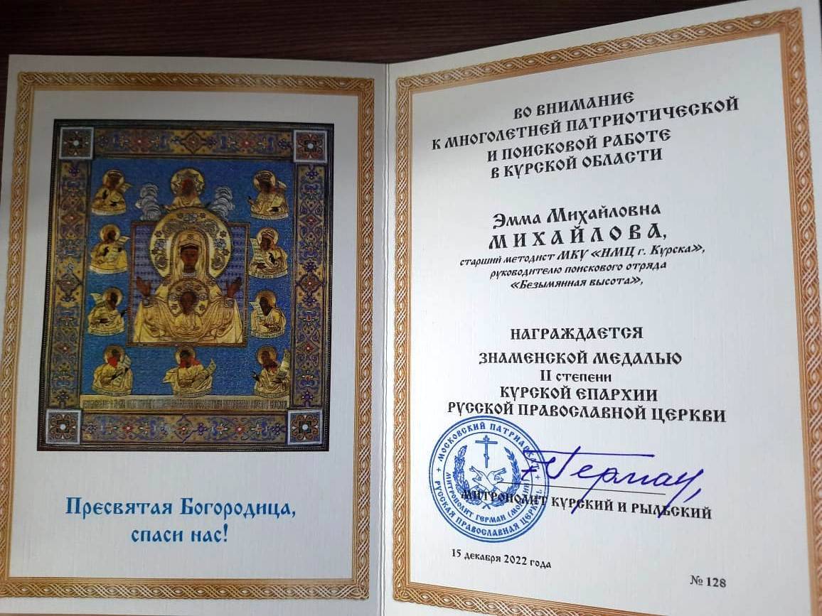 Командиры и бойцы поисковых отрядов получили заслуженные награды от Курской епархии, военного комиссариата, Совета ветеранов, Центра «Поиск». Среди награжденных Знаменской медалью Курской епархии – член РВИО Э.М. Михайлова.