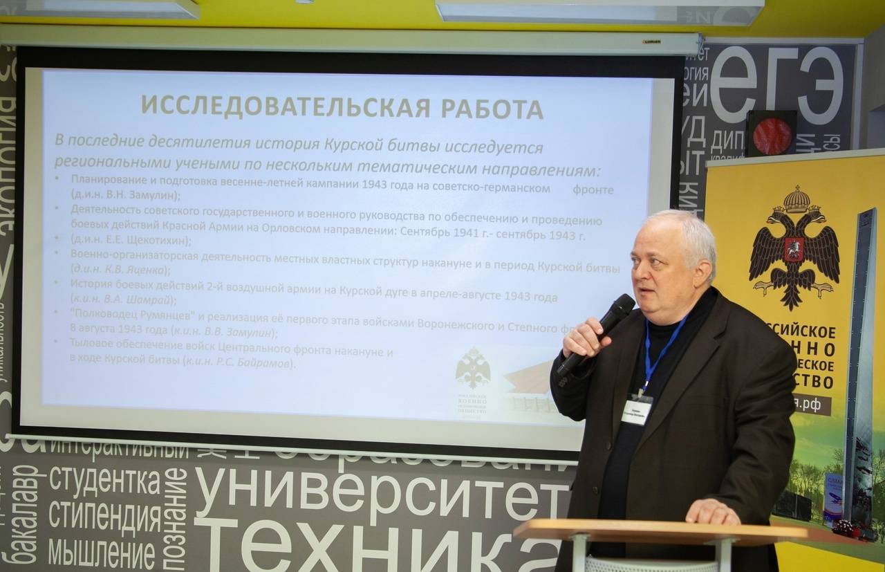 На пленарном заседании конференции выступил Владимир Коровин – председатель Совета регионального отделения РВИО в Курской области, профессор ЮЗГУ, доктор исторических наук. Владимир Викторович рассказал о современной военно-мемориальной работе, которая проводится на земле Великой битвы. Именно отсюда начинал свой боевой путь будущий ученый-историк Александр Колпаков, воевавший на северном фасе Курской дуги в должности начальника радиостанции отдельной роты связи 6-го истребительного авиакорпуса 16-й воздушной армии.