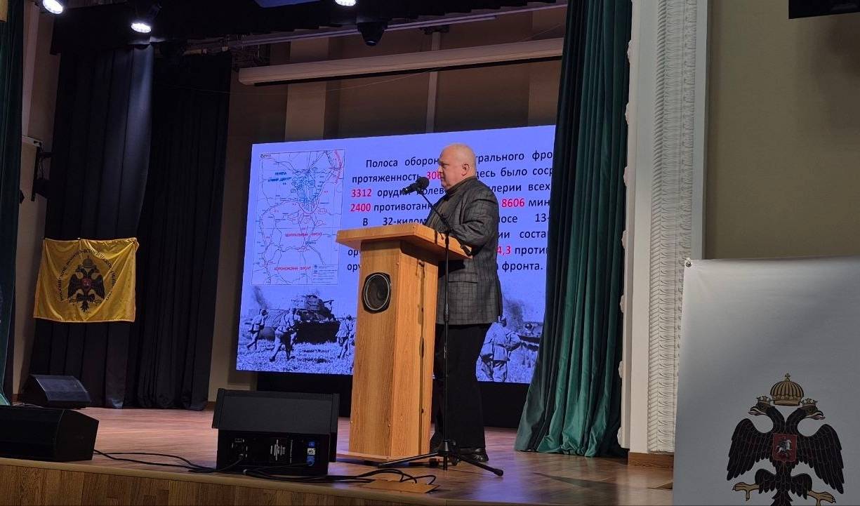 С докладом о боевой работе реактивной артиллерии Центрального фронта летом 1943 года на пленарном заседании выступил Владимир Коровин – председатель Совета регионального отделения Российского военно-исторического общества в Курской области, профессор ЮЗГУ, доктор исторических наук.