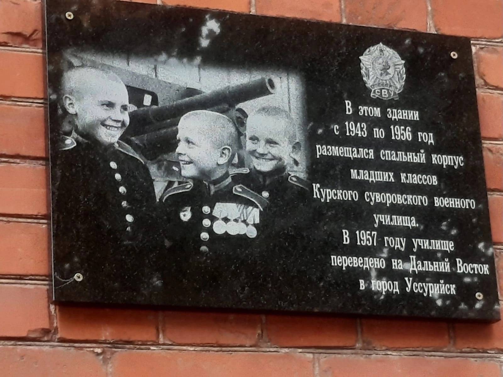Курское суворовское училище открылось в 1943 году. На фасаде дома № 42-А по улице Садовой, где располагался спальный корпус младших классов, по инициативе выпускников этого учебного заведения – ветеранов Вооруженных Сил – установлена мемориальная доска. Право ее торжественного открытия предоставили воспитаннику музыкального взвода Курского суворовского военного училища Евгению Ильичу Елинскому и юнармейцу школы № 61 города Курска Богдану Гончаренко. Школа, в которой учится будущий защитник Отечества, носит имя Петра Михина – фронтовика, писателя и бывшего преподавателя Курского суворовского училища.