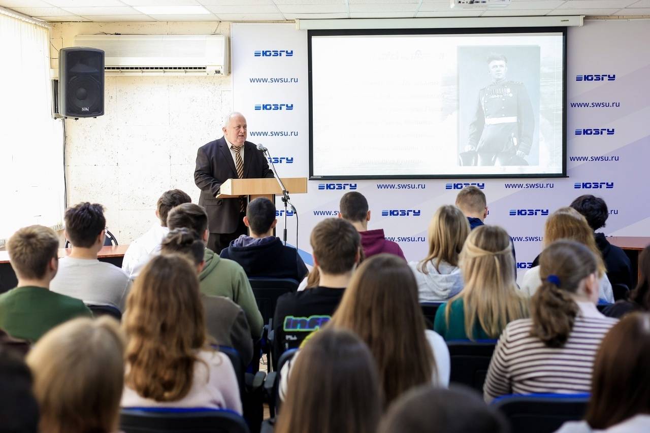 Очередную историко-патриотическую встречу в ЮЗГУ провели для студентов-первокурсников, которые осваивают учебную дисциплину «Основы российской государственности». Она посвящалась 120-летию со дня рождения Сергея Руденко – маршала авиации, Героя Советского Союза. В период Курской битвы Сергей Игнатьевич командовал 16-й воздушной армией, сражавшейся на северном фасе Курской дуги.