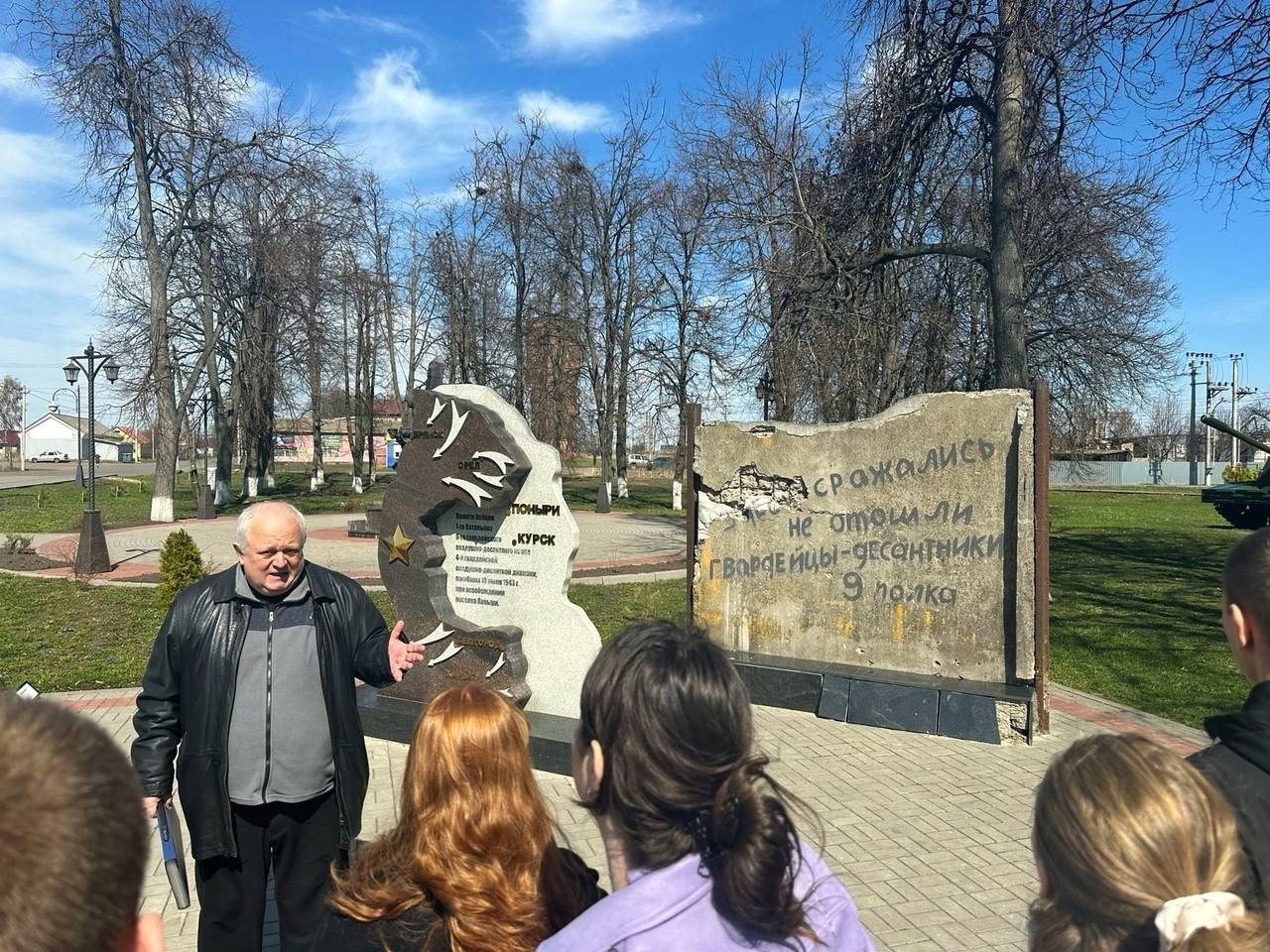 Владимир Викторович познакомил ребят со знаковыми датами и событиями Курской битвы. Он рассказал о подвигах воинов, в честь которых были сооружены в 1943-м памятники героям-артиллеристам и героям-саперам. Молодые люди узнали о решающих боях на Тепловских высотах, где сейчас находится мемориальный комплекс «Поклонная высота 269».