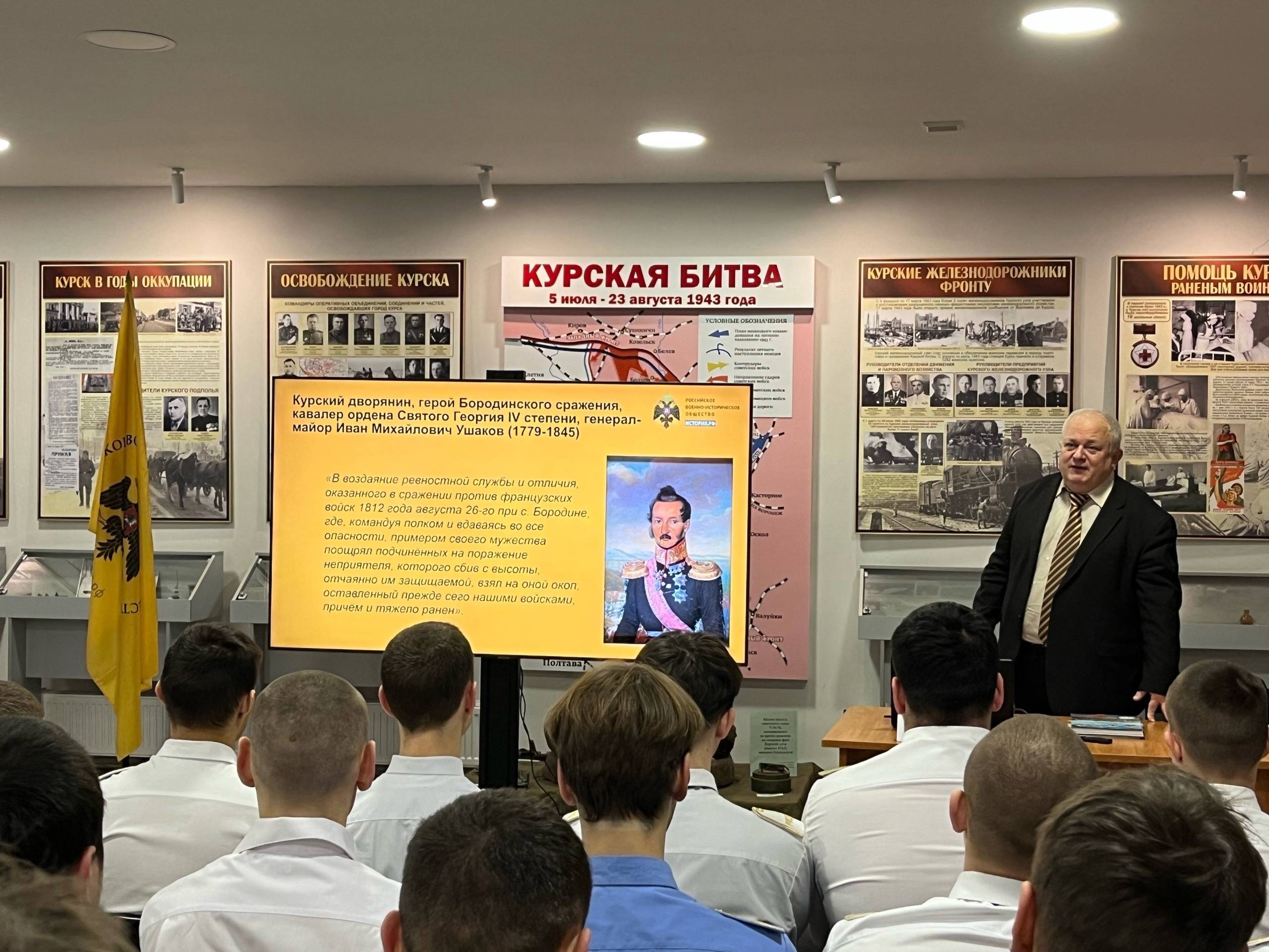 Владимир Викторович рассказал студентам Курского железнодорожного техникума о наградах за воинские доблести, которые вручались в Российской империи, Советском Союзе и современной России. Особое внимание он уделил героям – уроженцам города Курска и Курской области.