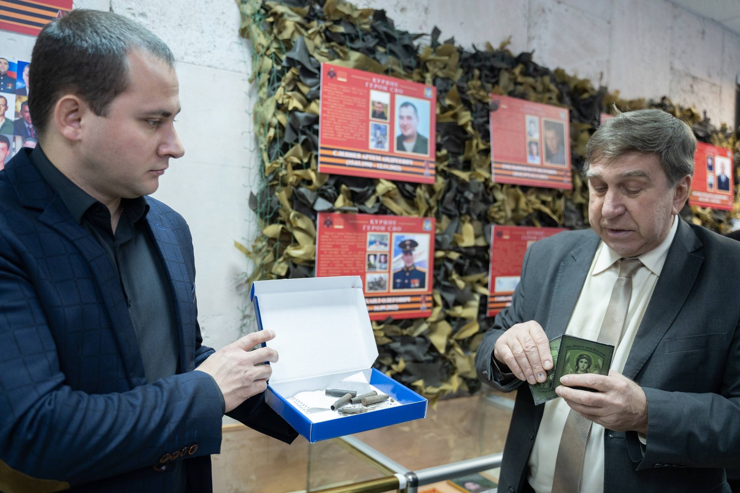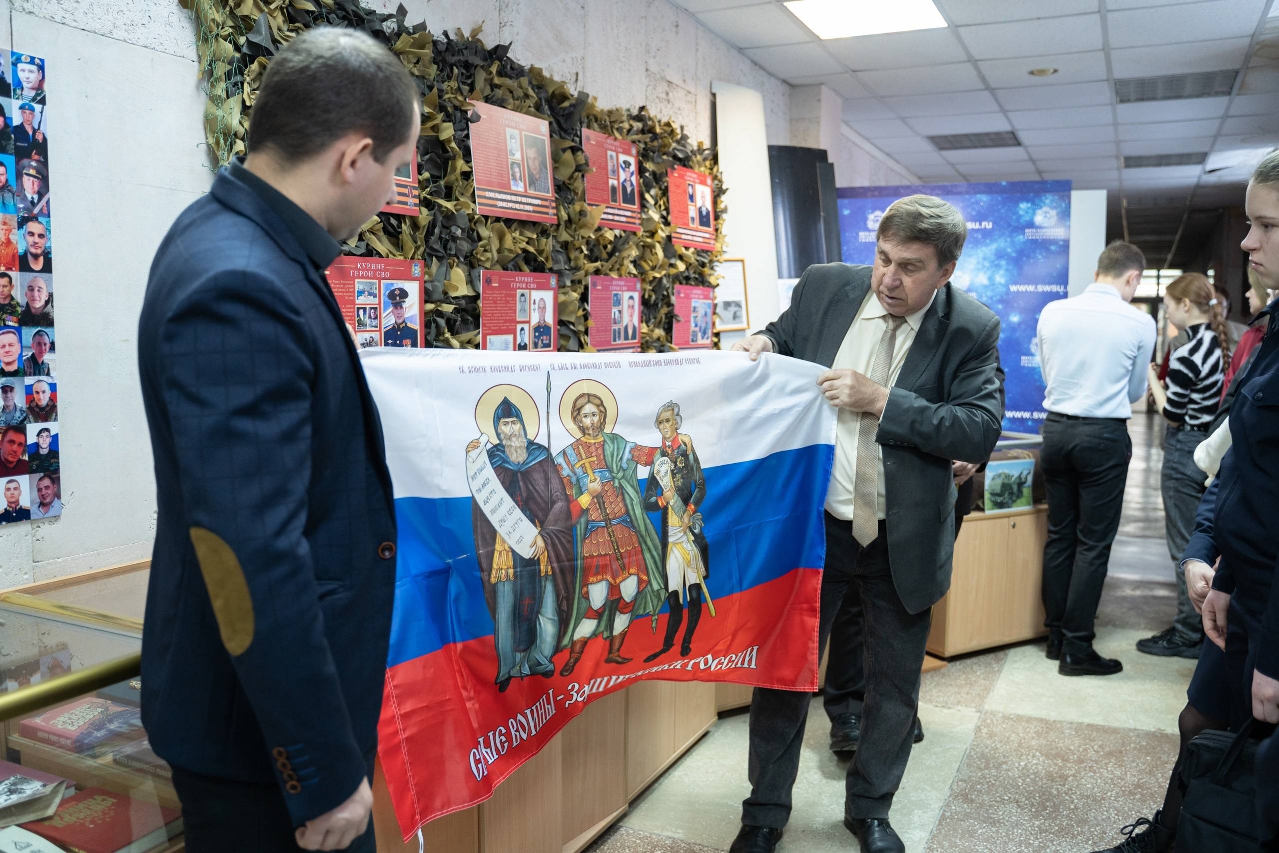 Владимир Быканов передал в дар музею университета артефакты из зоны проведения СВО. Особое место в экспозиции займет подарок от крымчан – стяг с изображением великих русских полководцев, князя Александра Невского и Александра Суворова, а также монаха-воина Александра Пересвета.