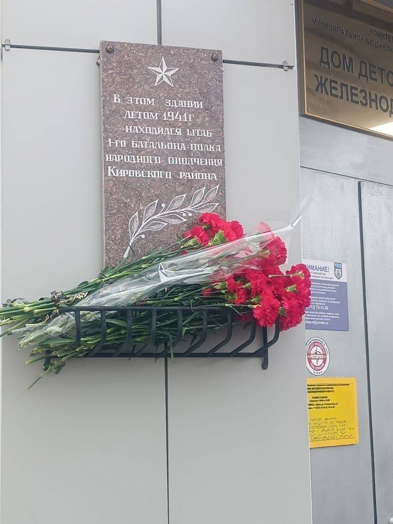 Мероприятие завершилось возложением цветов к мемориальной доске на фасаде Дома детского творчества. Она установлена в память пребывания в этом здании в 1941 году штаба батальона Кировского полка народного ополчения.