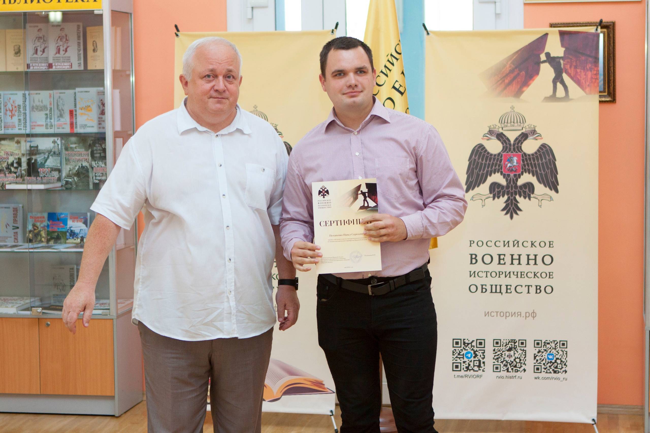 Юлия Николаевна и Владимир Викторович вручили членские билеты новым активистам регионального отделения и сертификаты выпускникам школы экскурсоводов волонтеров по военно-историческим маршрутам.