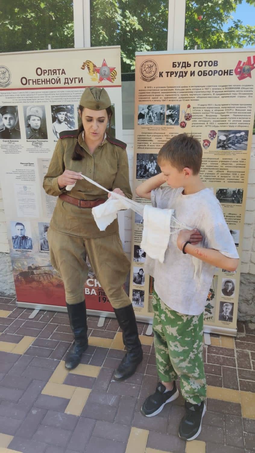Увлекательную встречу на территории санатория «Соловушка» провели члены Российского военно-исторического общества, сотрудники военно-исторического музея «Юные защитники Родины» имени Клары Рябовой: Елена Добросердова и Ольга Попова – участница военно-исторического клуба «Курская дуга».