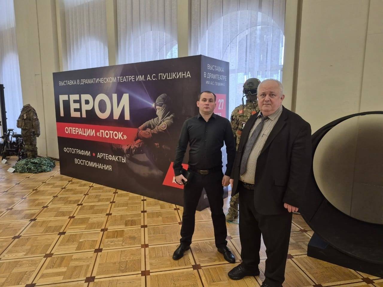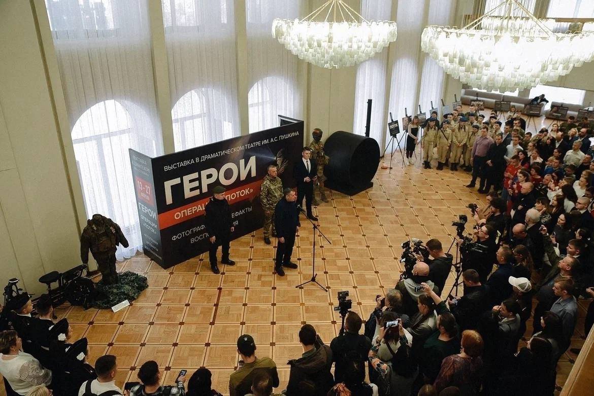 Выставку открыли член Центрального совета РВИО, врио губернатора Курской области Александр Хинштейн, экс-глава Суджанского района, доброволец бригады «Ветераны» Александр Богачёв и командир разведгруппы спецназа «Ахмат» с позывным «Аид» Бекхан Юнусов.