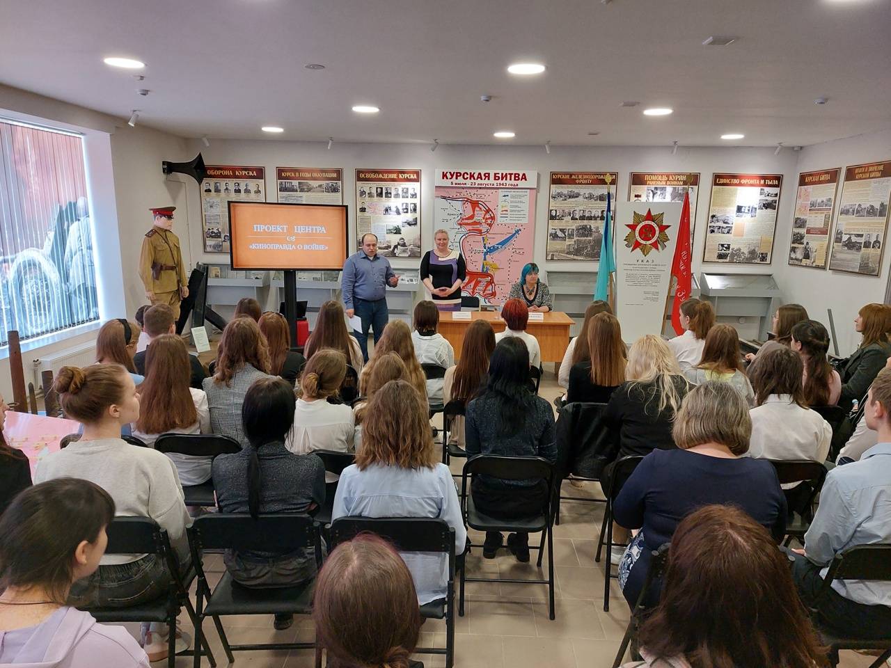 Возложив цветы к памятному знаку, юные куряне приняли участие в творческой встрече с автором цикла документальных фильмов "Страницы истории", членом Союза кинематографистов России, генеральным директором ООО «СИНЕМАЛОРА» режиссёром Ольгой Антроповой. Участники встречи, проходившей в выставочном центре "Курск – город воинской славы" в рамках проекта "Киноправда о войне" познакомились с двумя фильмами цикла под названием "Чтобы помнили" и "Будем жить...", которые помогли зрителям осознать бесчеловечность фашизма, познакомиться с судьбами тех, кто прошел тот ужас... Также в рамках мероприятия была анонсирована следующая картина студии, посвящённая льговским молодогвардейцам. О ней рассказала Анна Романова, дипломант областного фестиваля авторской песни "Афганский излом", которая прочла своё стихотворение "Когда уйдёт последний ветеран", написанное специально для фильма.