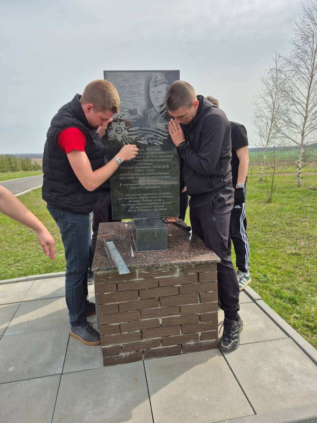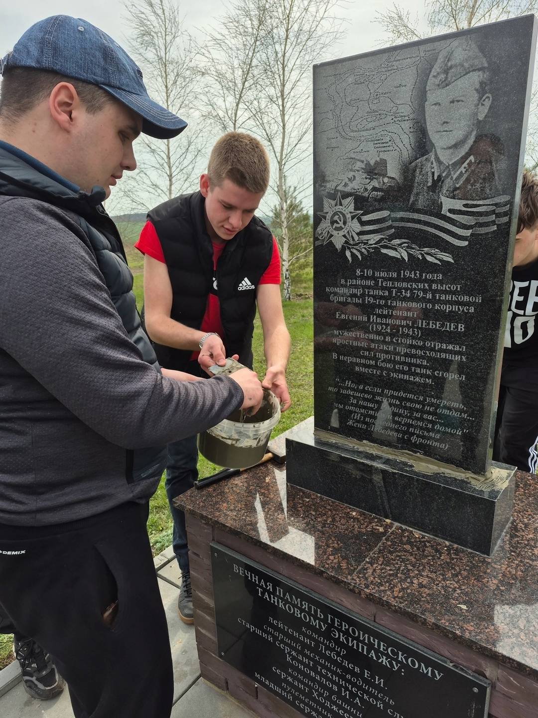 В этом году он приурочен к православной Пасхе. В нем приняли участие председатель Совета регионального отделения Российского военно-исторического общества, профессор ЮЗГУ Владимир Коровин, члены РВИО директор музея ЮЗГУ Евгений Головин и преподаватель университета Павел Потапенко, а также активисты студенческого патриотического клуба «Порубежник». Общими усилиями коллеги укрепили стелы и привели в порядок территорию у памятных знаков: в честь танкового экипажа лейтенанта Евгения Лебедева, воинов 258-го стрелкового полка 140-й стрелковой дивизии на высоте 274,5 и артиллерийского расчета сержанта Алексея Петрова. Все эти мемориальные объекты были установлены в течение 12 лет спортивным радиоклубом «Спорадик» ЮЗГУ и региональным отделением РВИО в Курской области.