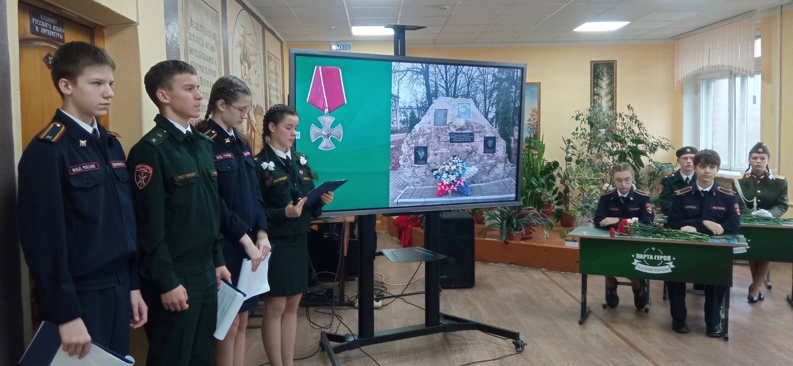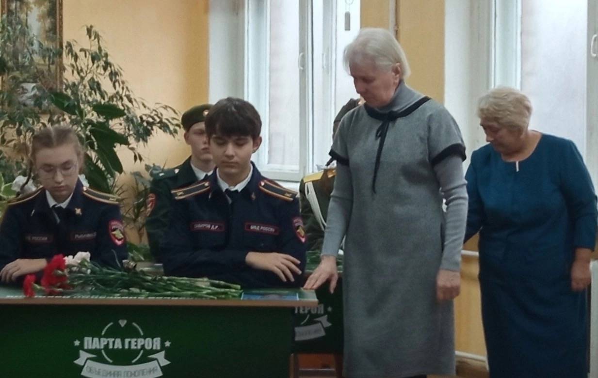 Почетное право сесть первыми за «Парту героя» предоставили школьникам, которые отличились в учебе, общественной и спортивной жизни учреждения. Это воспитанники кадетских классов: Матвей Байтитский, Елизавета Конева, Дарья Рыбкина, Дмитрий Сабиров.