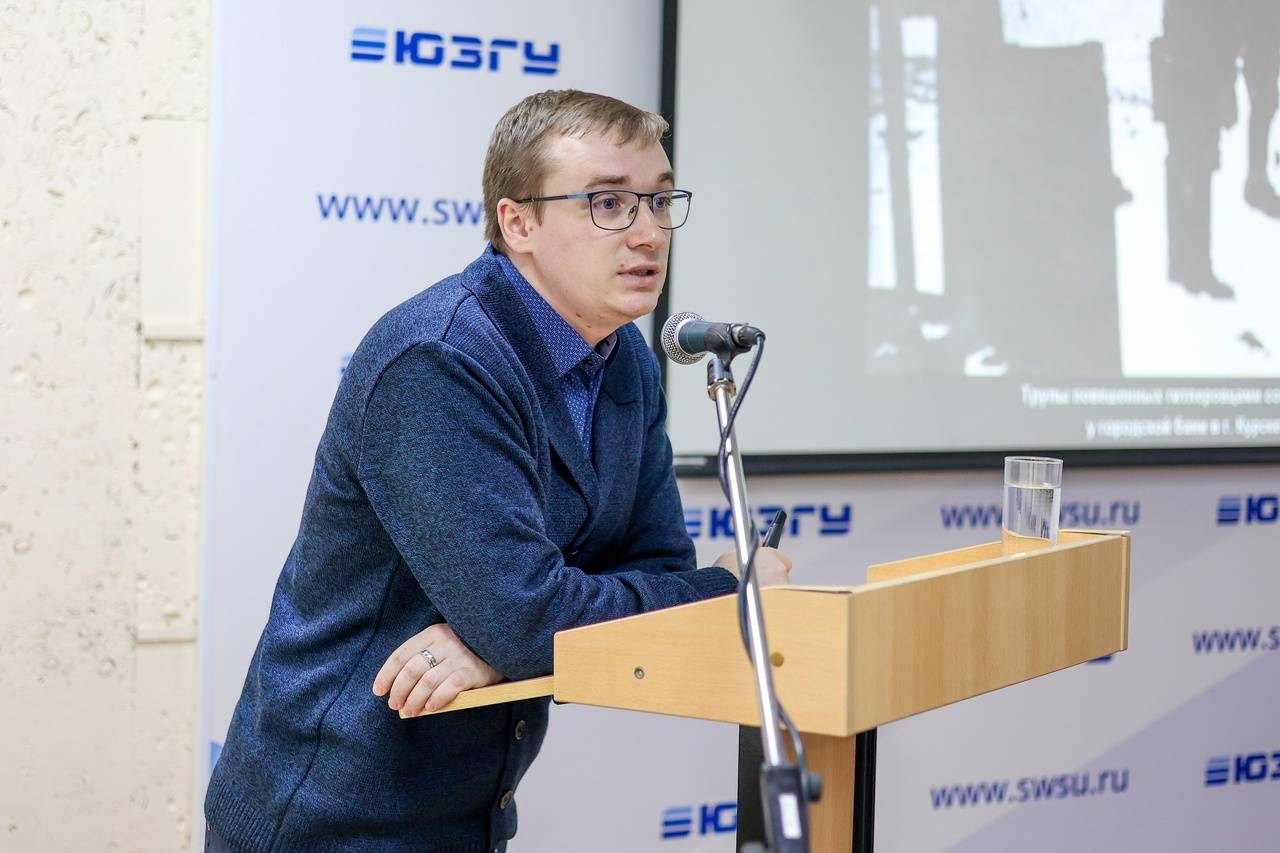 Тему геноцида жителей Курской области в годы Великой Отечественной войны продолжил Олег Аргунов. Он познакомил присутствующих с архивными документами, фотографиями и результатами поисковых работ на месте массовых захоронений жертв фашистов. Олег Николаевич также провел параллели со страшными преступлениями неонацистов на территории Курского приграничья.