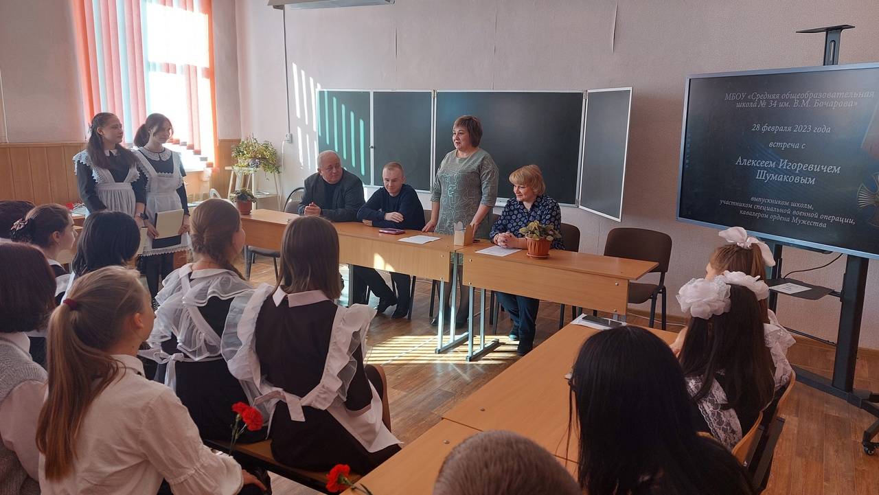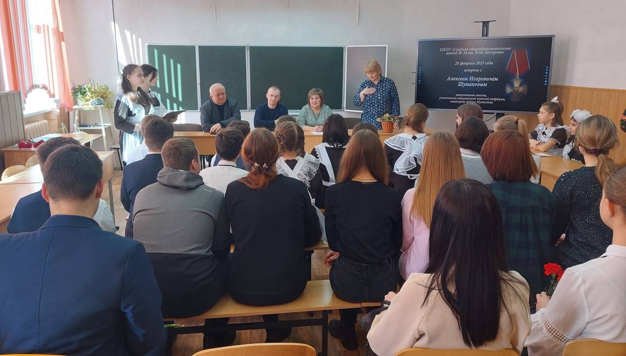 27 февраля 2023 года на базе музея «Они учились в нашей школе» школы № 34 города Курска состоялась встреча активистов городской воспитательной программы «Наследие предков в достойных руках» с участником специальной военной операции, выпускником этой школы Алексеем Шумаковым. Юные музееведы, принявшие участие в общении с одним из героев СВО, получившим в бою тяжелые ранения, удостоенным за воинскую доблесть ордена Мужества, получили от гостя ответы на волновавшие их вопросы о том, что чувствует в экстремальной ситуации обыкновенный парень, на долю которого выпала святая обязанность встать на защиту своего Отечества.