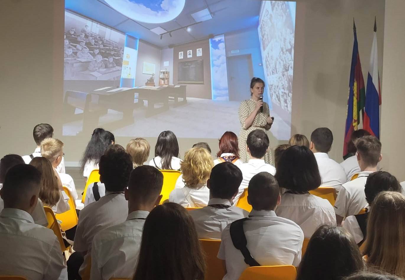 О создании нового музея рассказала сотрудник Департамента науки и образования РВИО к.и.н. Виктория Игоревна Петракова. Она выступила с уроком, посвященным Юным Защитникам Родины для учащихся 7-8 классов гимназии 8 города Сочи.